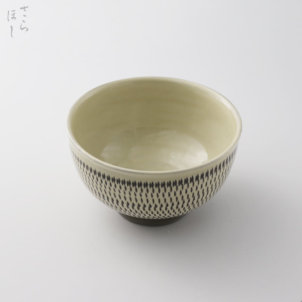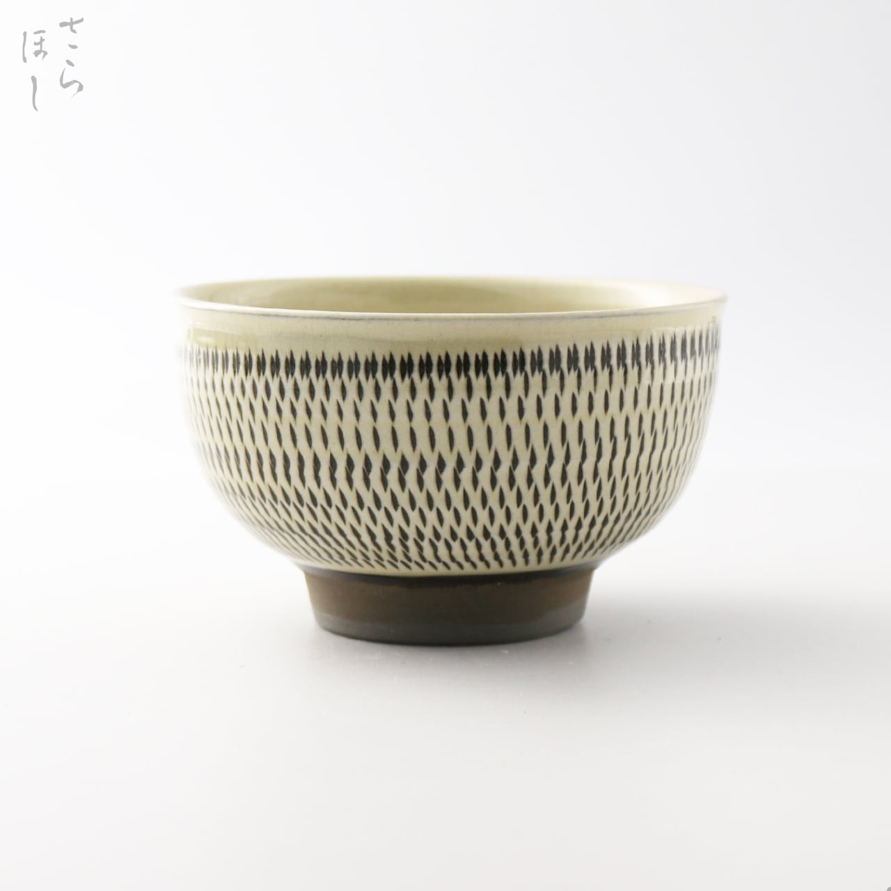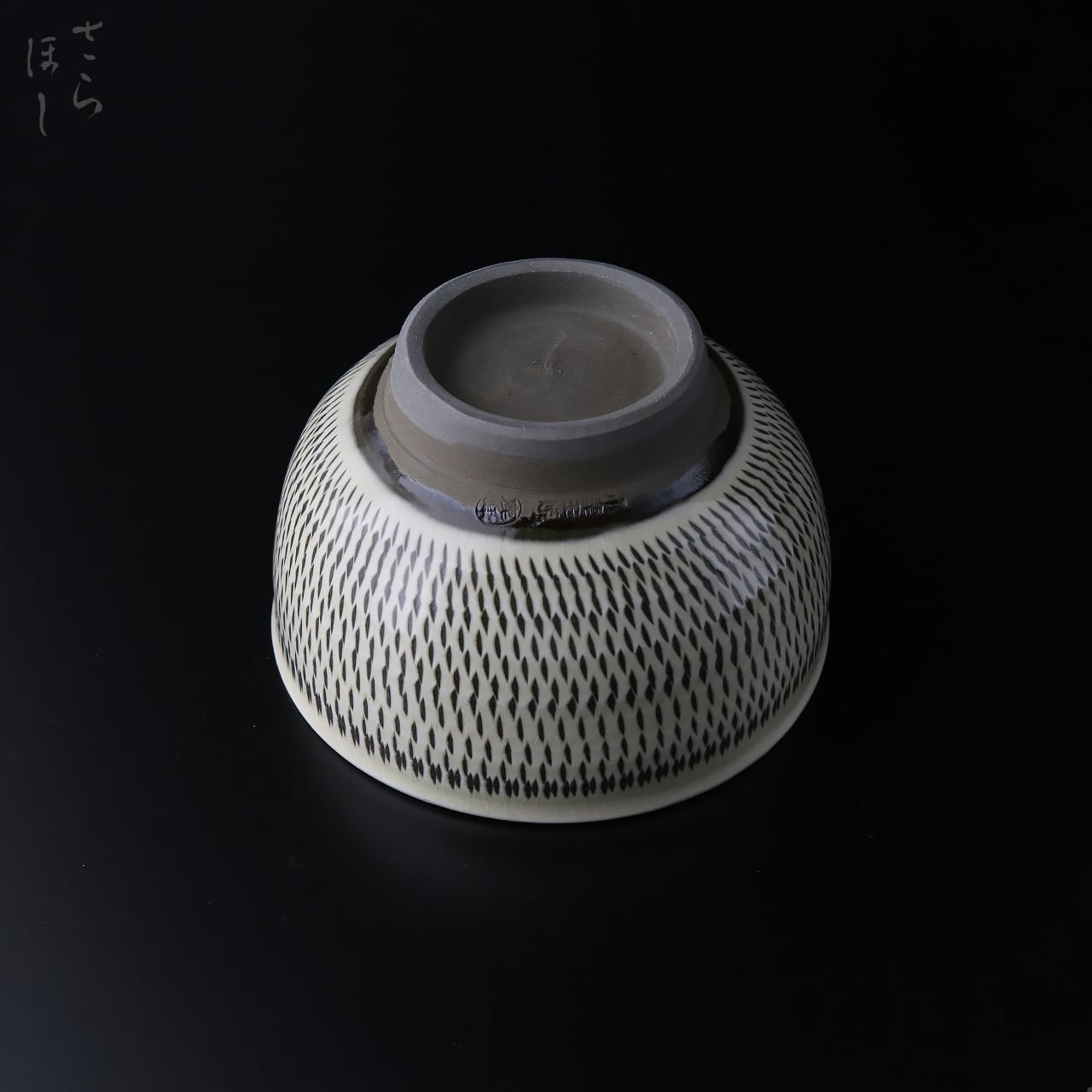 器の外側に小鹿田焼の伝統技法である「飛び鉋(かんな)」を施しています。弾力性のある金属で作った鉋を使用し、細かい連続的な削り目をつけ模様をつける技法です。口縁には反りがあり、口当たりがよく作られています。