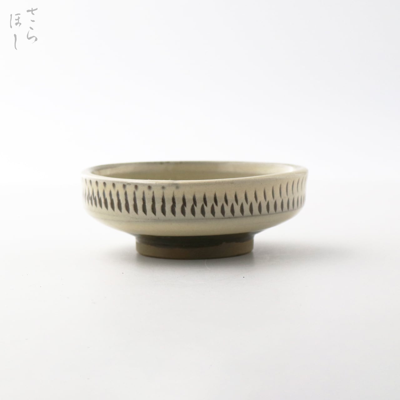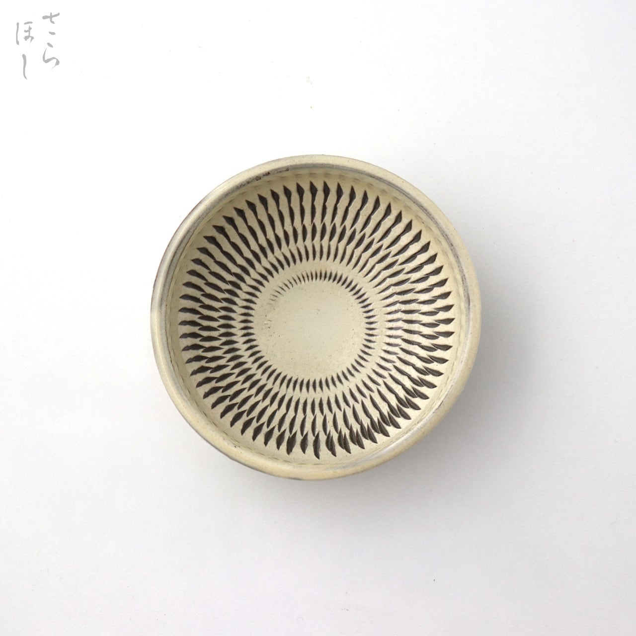 器の内外に小鹿田焼の伝統技法である「飛び鉋(かんな)」を施しています。弾力性のある金属で作った鉋を使用し、細かい連続的な削り目をつけ模様をつける技法です。