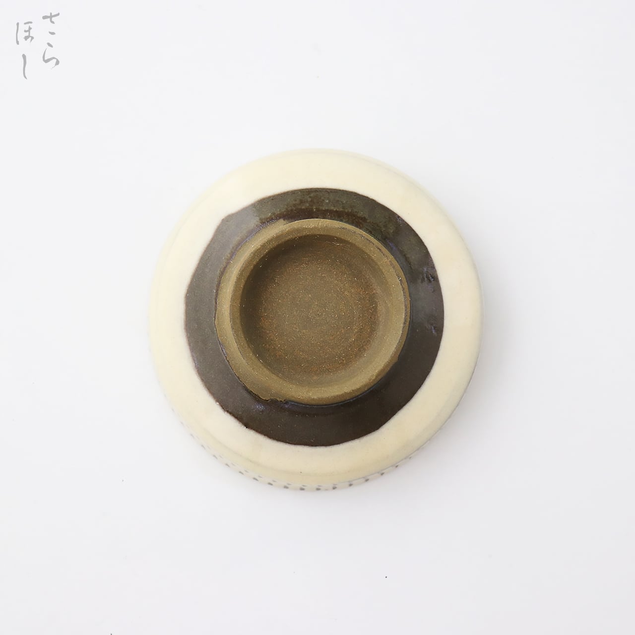 ・お皿等、窯で重ねて焼くものには、中央付近に白い円(目剥ぎ)があるものと無いものがあります。ご注文の際は目剥ぎの有無をご指定いただけません。ご了承ください。重なった部分がくっついてしまわないよう、釉薬を剥がした跡が白い円となって現れたものす。一番上で焼かれたものや、重ねずに焼かれたものには目剥ぎがありません。