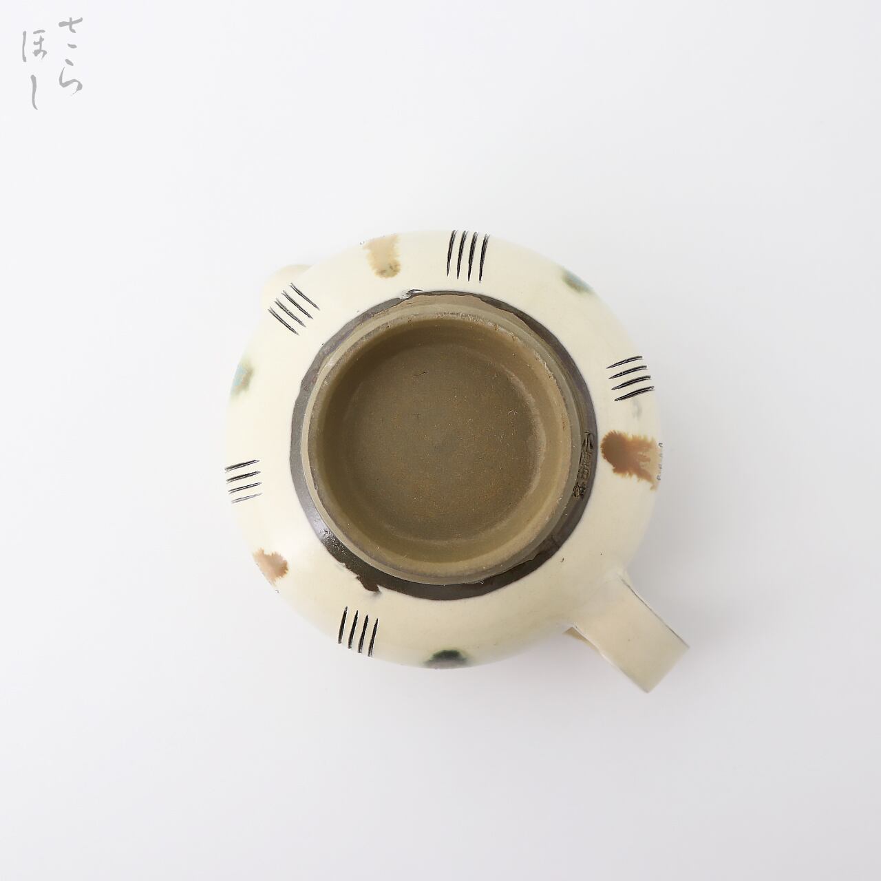 ・お皿等、窯で重ねて焼くものには、中央付近に白い円(目剥ぎ)があるものと無いものがあります。ご注文の際は目剥ぎの有無をご指定いただけません。ご了承ください。重なった部分がくっついてしまわないよう、釉薬を剥がした跡が白い円となって現れたものす。一番上で焼かれたものや、重ねずに焼かれたものには目剥ぎがありません。