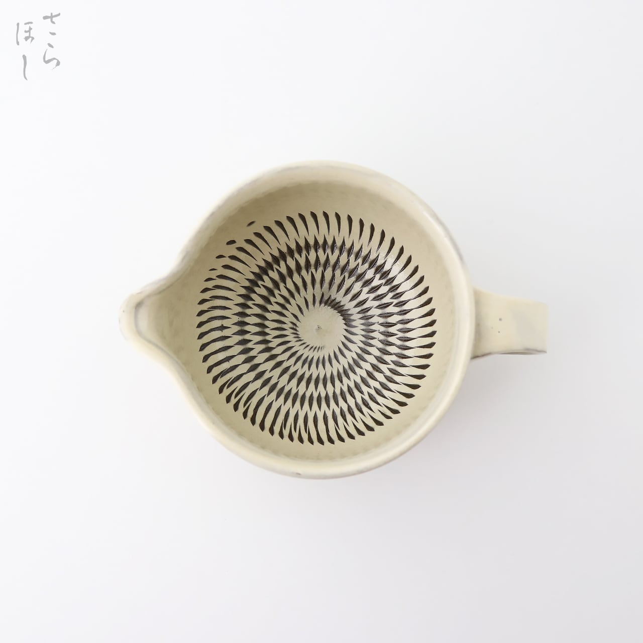 器の内側に小鹿田焼の伝統技法である「飛び鉋(かんな)」を施しています。弾力性のある金属で作った鉋を使用し、細かい連続的な削り目をつけ模様をつける技法です。器の外側には小鹿田焼の伝統技法である木材で波線を描く「櫛描き」が描かれています。