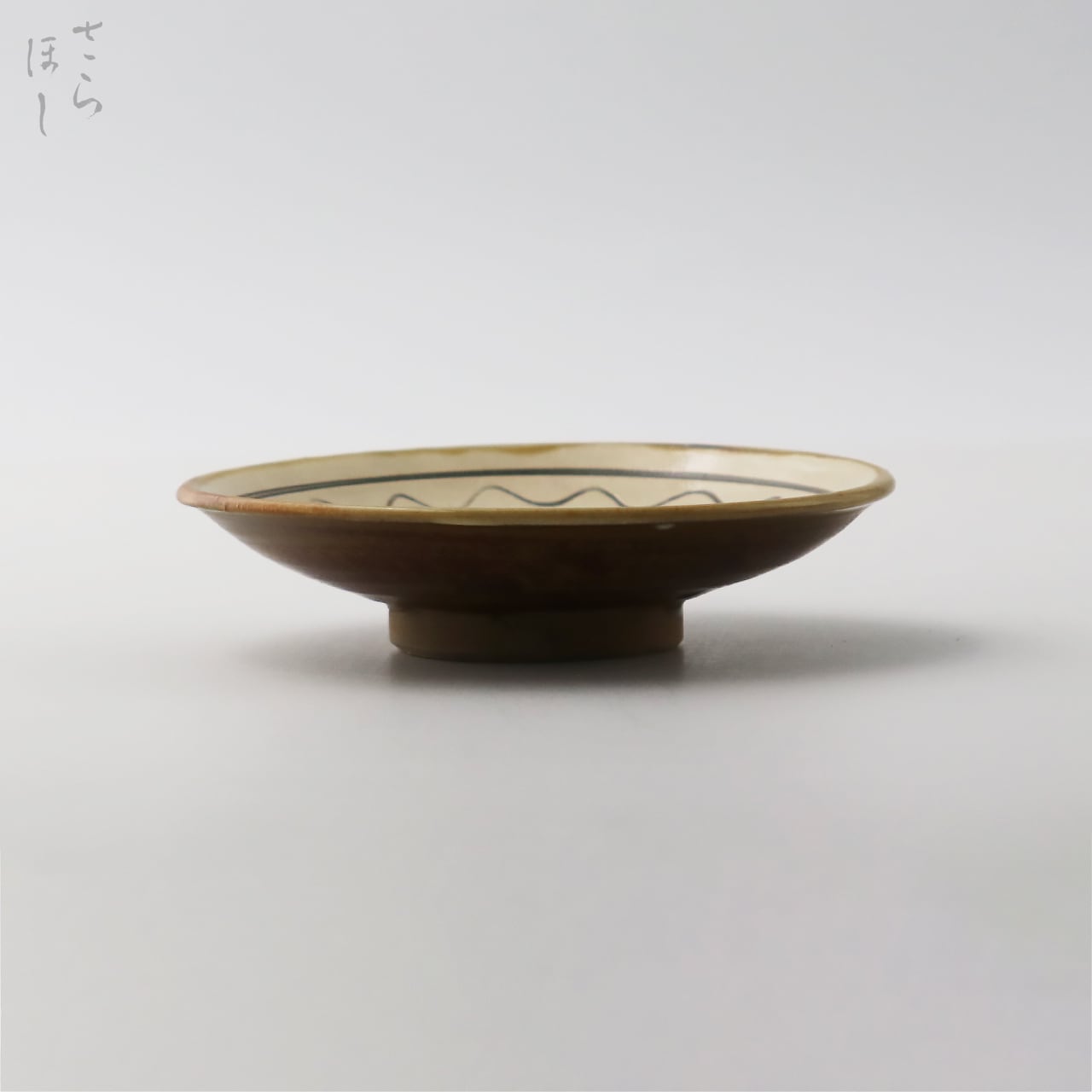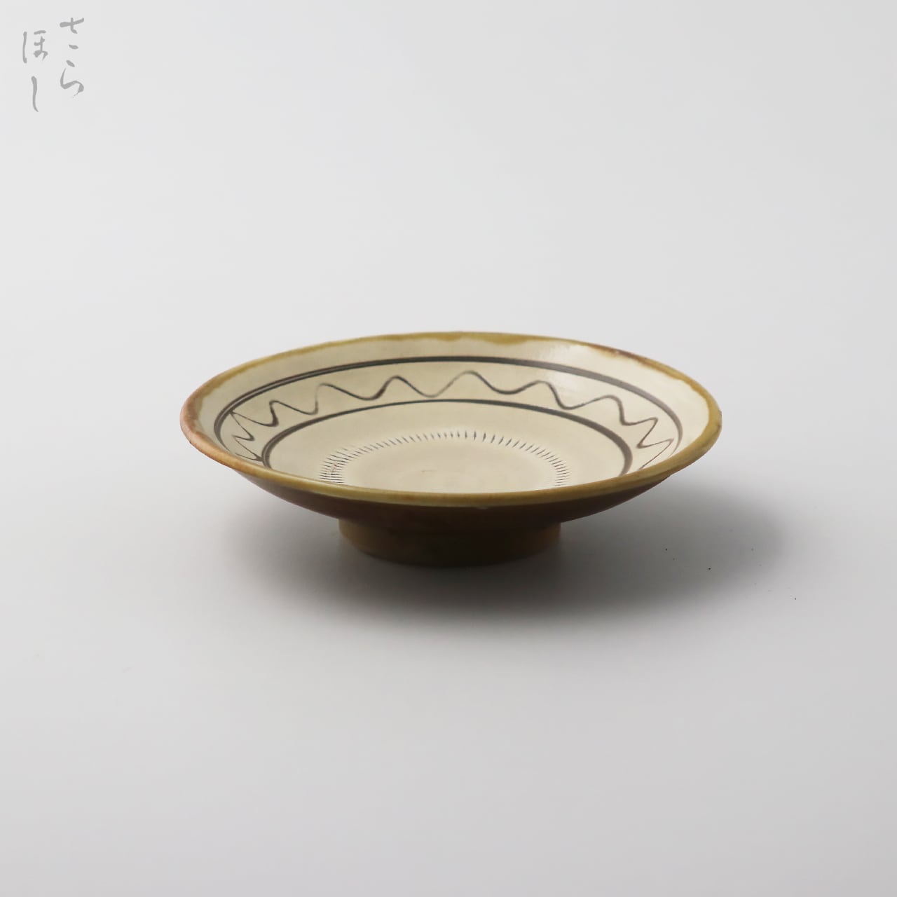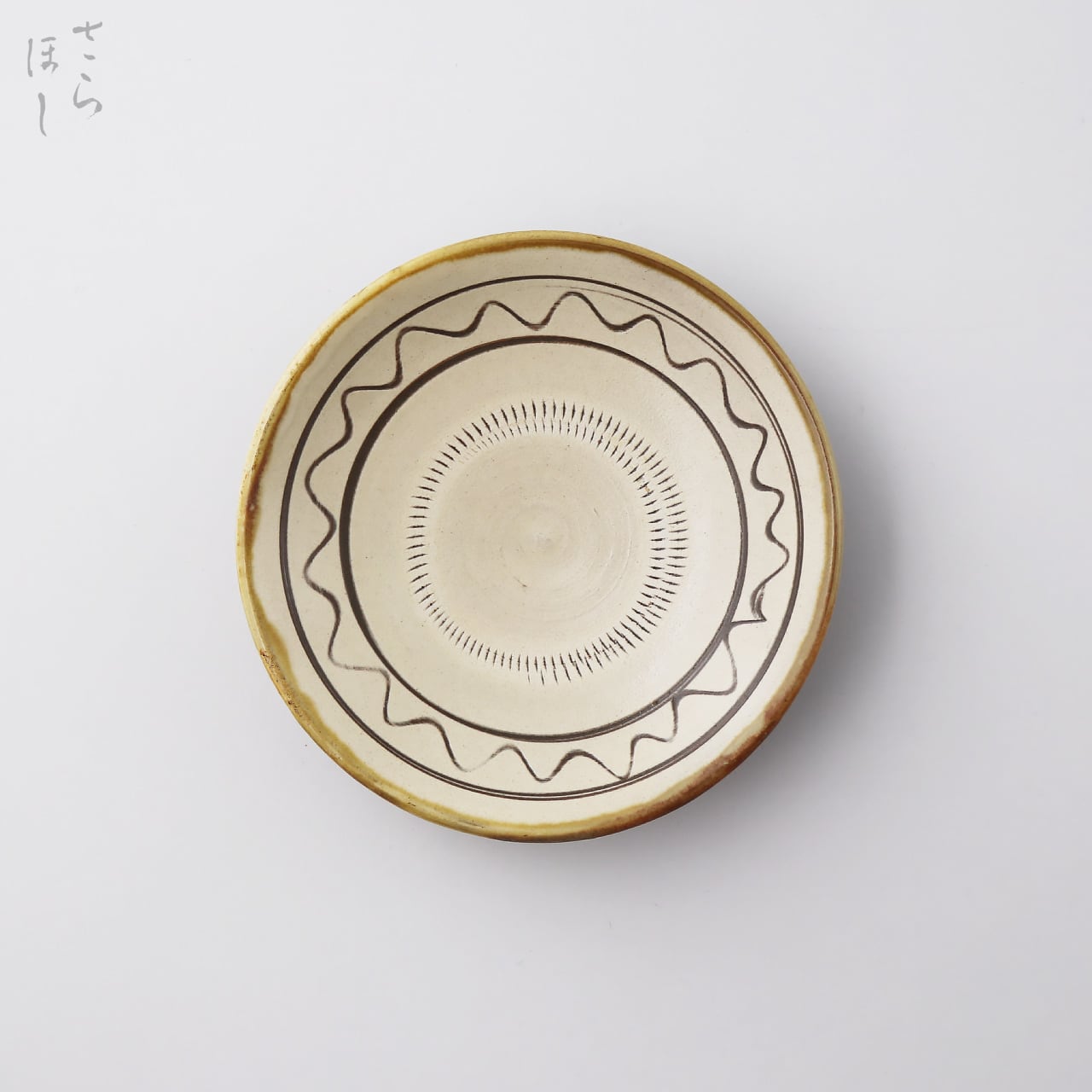 器の内側中央に小鹿田焼の伝統技法である「飛び鉋(かんな)」を施しています。足で蹴って回す蹴轆轤で回しながら、弾力性のある金属で作った鉋を押し当てて細かい連続的な削り目をつけ模様をつける技法です。さらに、周囲に木材で波線を描く「櫛描き」を加えて形をアクセントを加えています。余白を多くとった洗練されたデザインになっています。