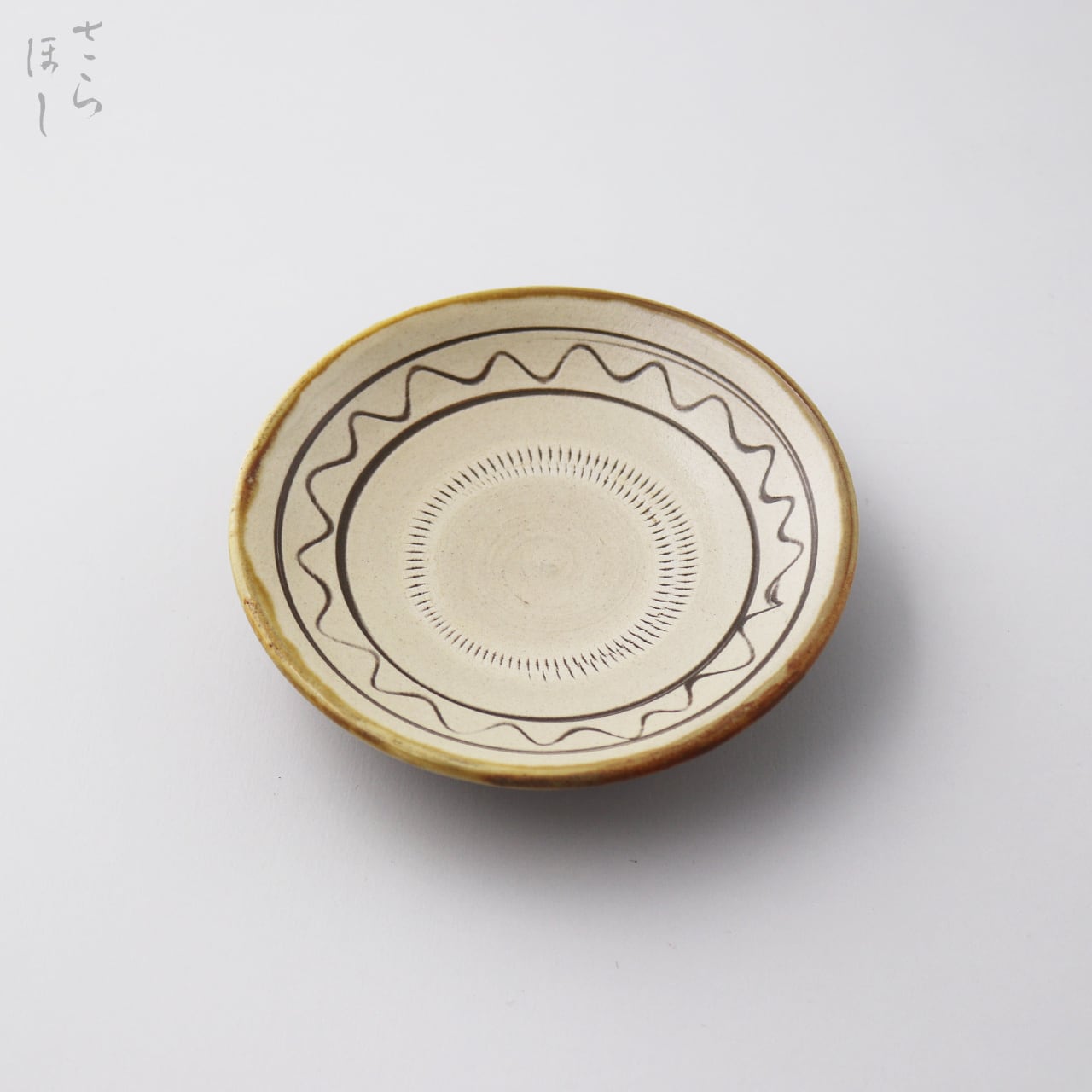 小鹿田焼(おんたやき)の飛び鉋/櫛書き4寸皿です。