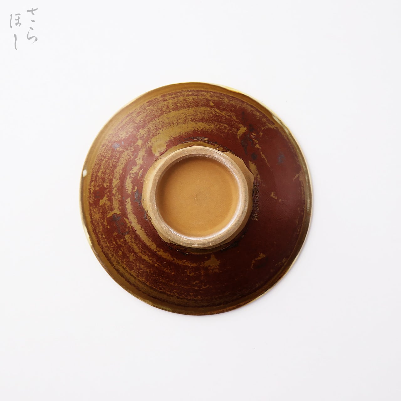 ・お皿等、窯で重ねて焼くものには、中央付近に白い円(目剥ぎ)があるものと無いものがあります。ご注文の際は目剥ぎの有無をご指定いただけません。ご了承ください。重なった部分がくっついてしまわないよう、釉薬を剥がした跡が白い円となって現れたものす。一番上で焼かれたものや、重ねずに焼かれたものには目剥ぎがありません。
