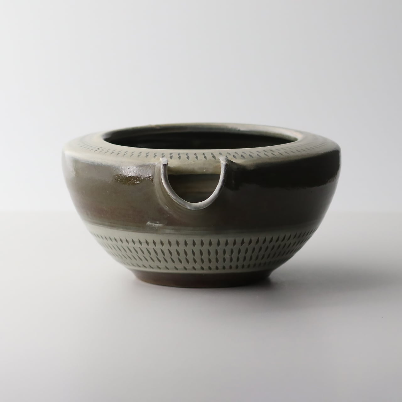 器の上部と下側に白化粧土を掛け、小鹿田焼の伝統技法である「飛び鉋(かんな)」を施しています。足で蹴って回す蹴轆轤に乗せて、弾力性のある金属で作った鉋を押し当て、バウンドさせながら細かい連続的な削り目をつけ模様をつける技法です。外側上部は素地を残して下部と色分けすることでアクセントを付けています。全体の作りとしては大らかでユーモラスなイメージです。