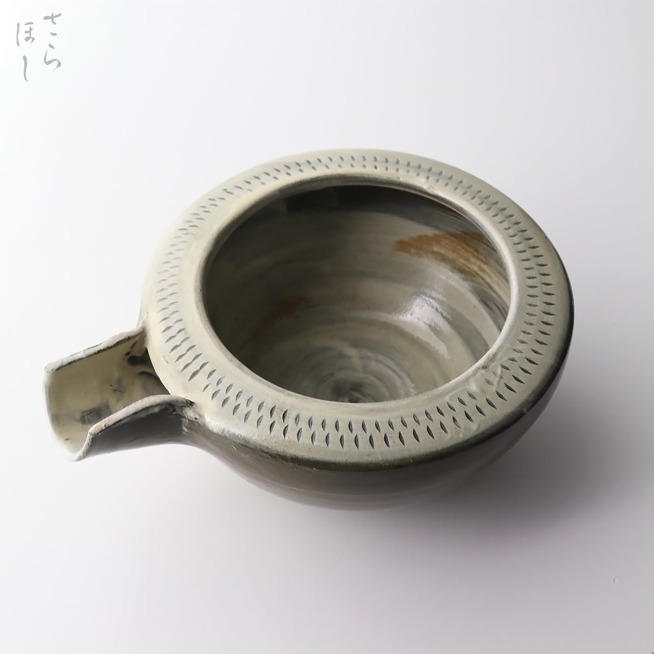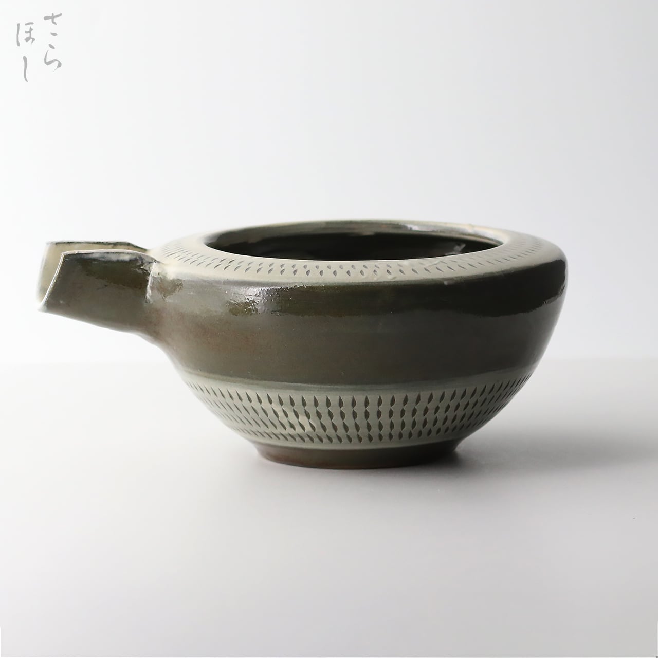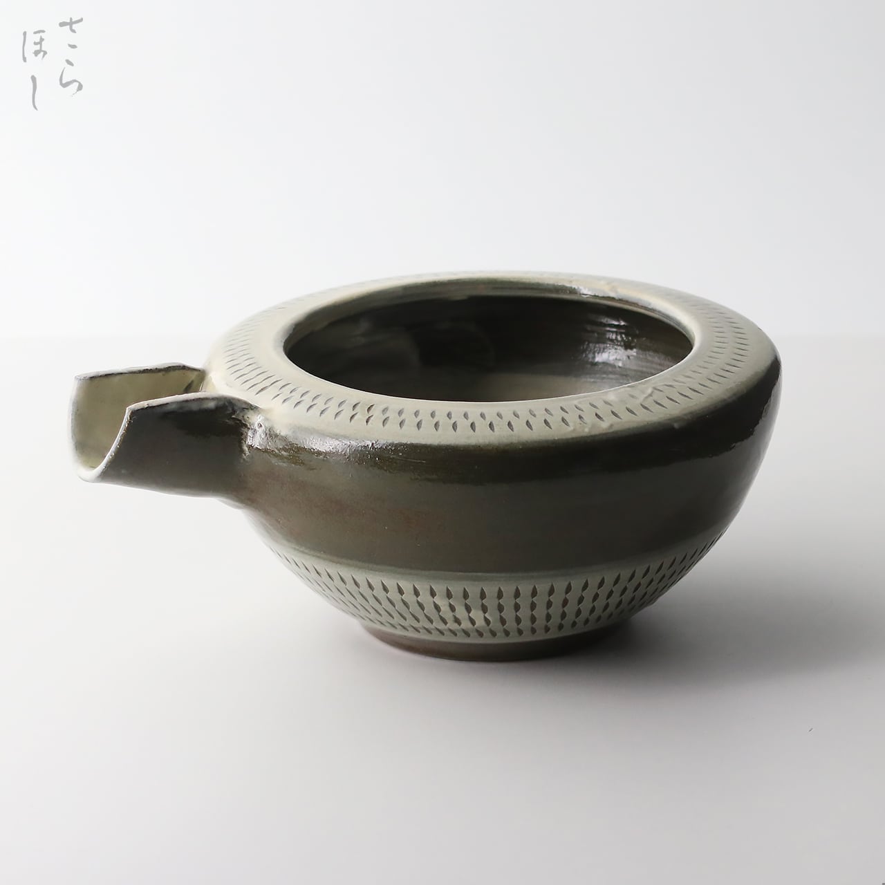 口縁の片側に注ぎ口が付き、酒など液体を注ぐ器として、また、食材を盛り付ける器としても利用できます。大き目の片口、器のボリュームで存在感があり、食器の他、花器や水鉢、インテリアなどにも使えます。