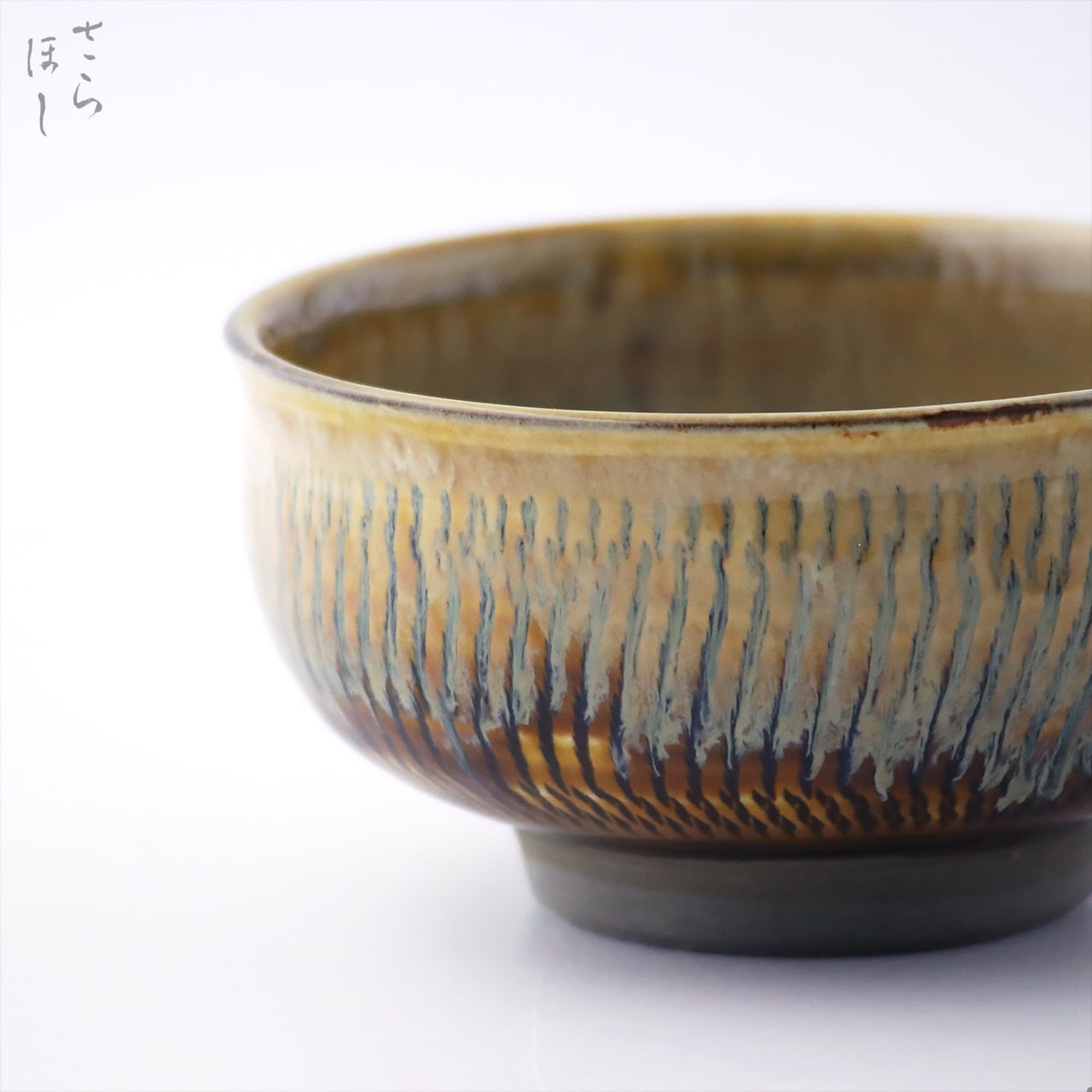 小鹿田焼 小袋窯 抹茶碗 銘 鹿峰 飛びかんな 飴/白なだれ 口径約12.8cm 茶 一点もの 陶器 茶道具 民藝