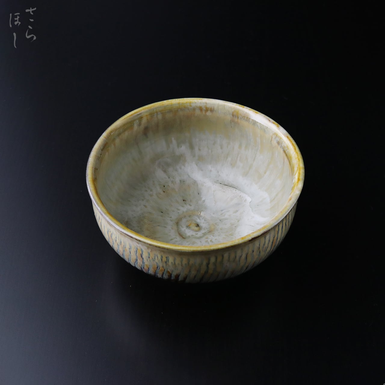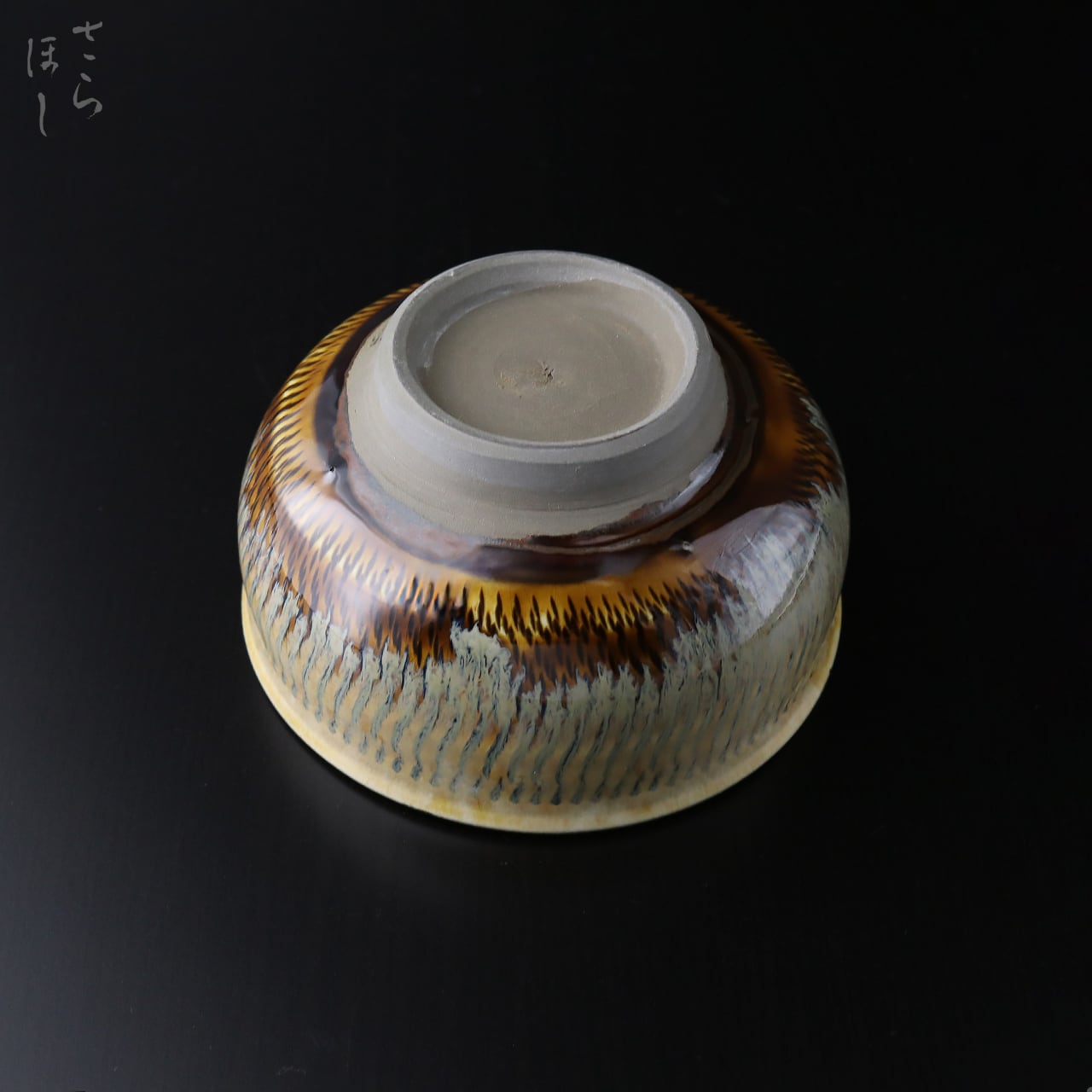 器の外側に小鹿田焼の伝統技法である「飛び鉋(かんな)」を施しています。飛び鉋は、成形後、足で蹴って回す蹴轆轤に乗せ、弾力性のある金属で作った鉋を押し当てて、バウンドさせながら細かい連続的な削り目をつけ模様をつける技法です。さらに、飴釉を掛けた後、白釉を口縁からなだれさせ、腰付近で白と飴の対比を荒々しく力強く描いています。見込み側は、風に吹かれた白波のようです。登り窯の自然の炎が油絵のような立体的で大胆な質感で描いて見せてくれました。