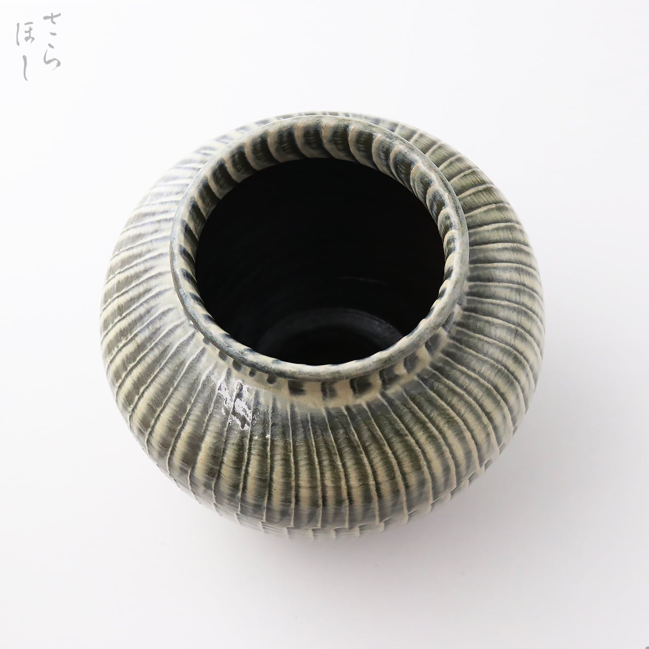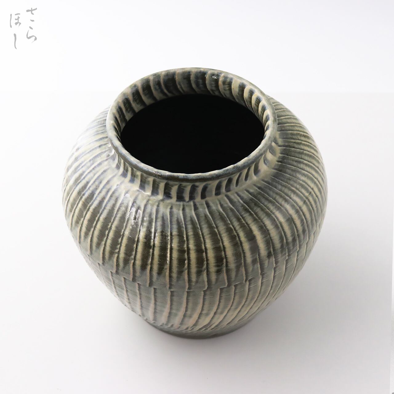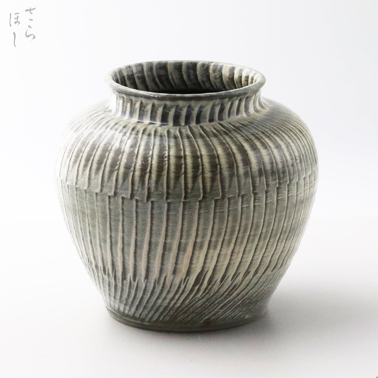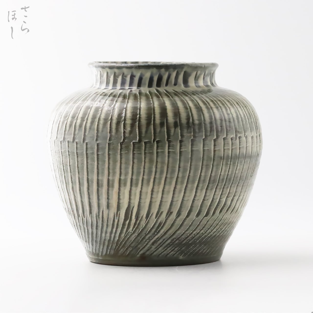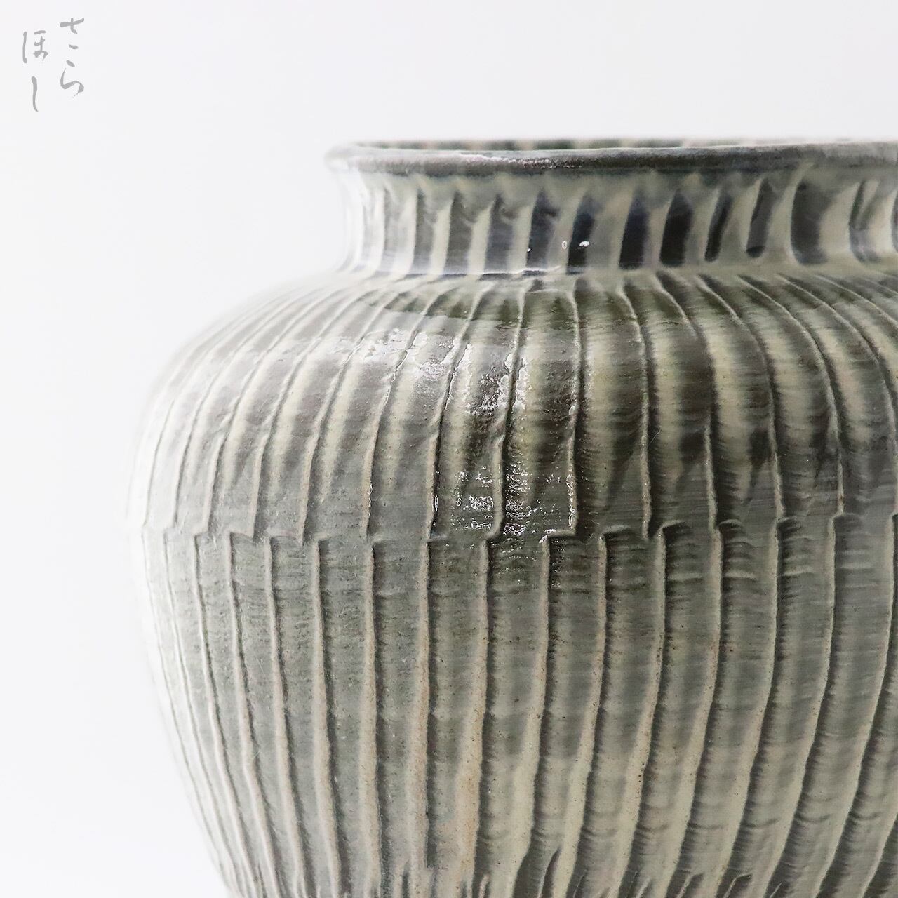 直径が約20cmの丸花瓶で、器の外側全面に小鹿田焼の伝統技法で「打ち刷毛目(はけめ)」を施しています。刷毛を使って白化粧土をぐるりと塗り、足で蹴って回す蹴轆轤に乗せて連続的に刷毛を打ち付けて模様をつける技法です。