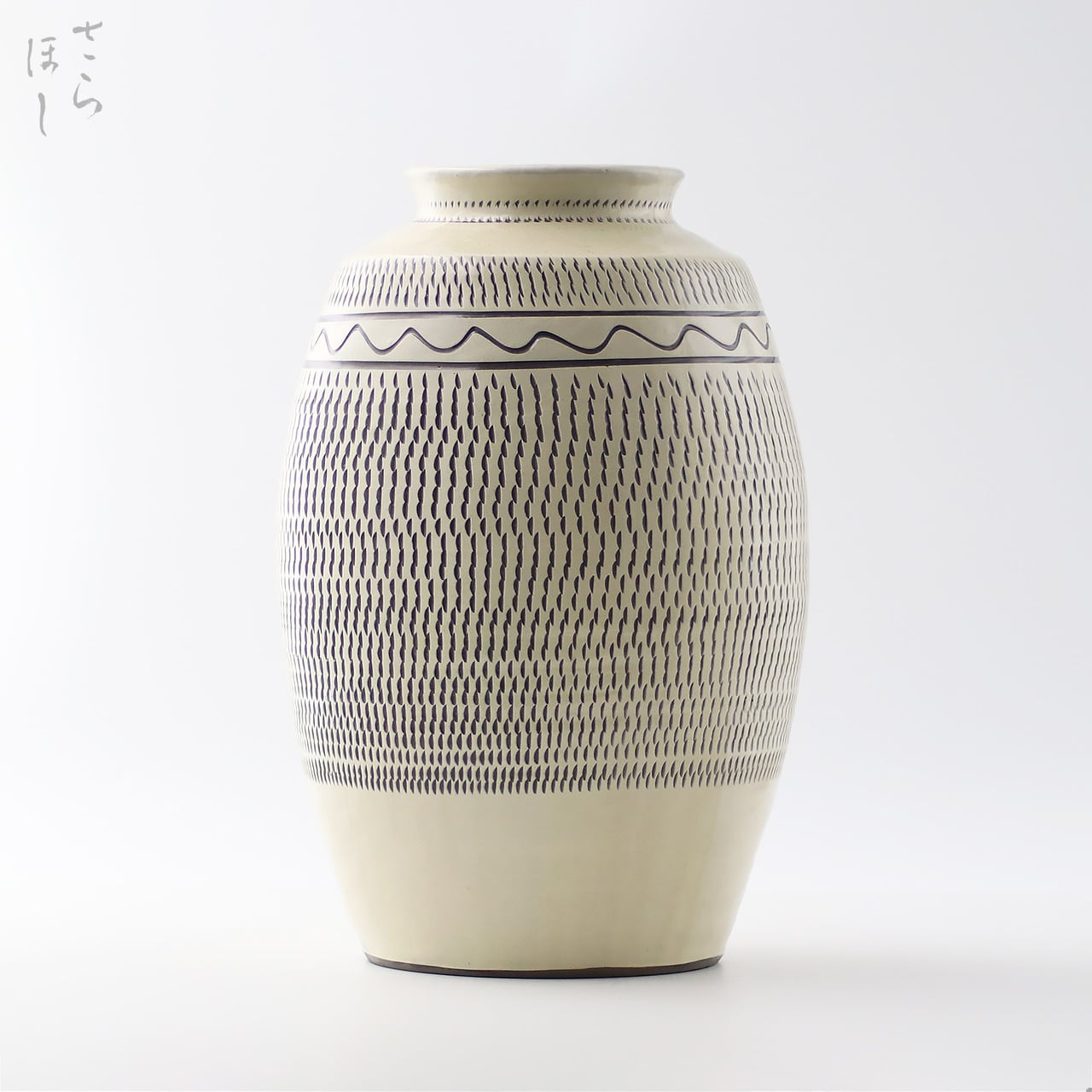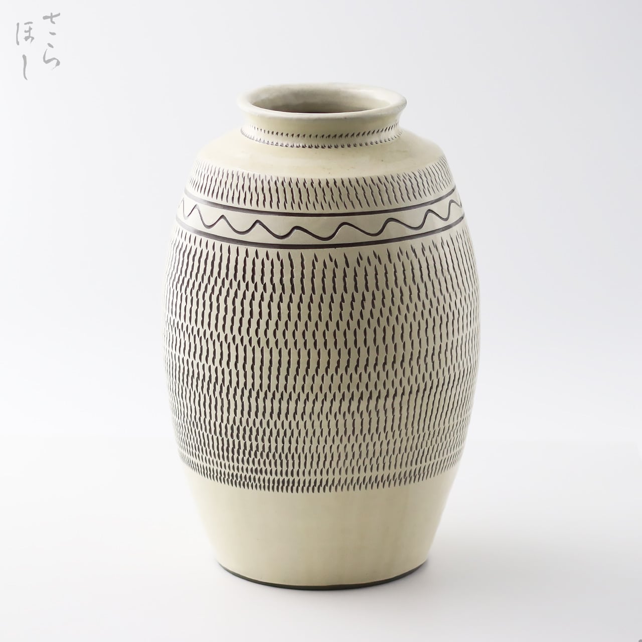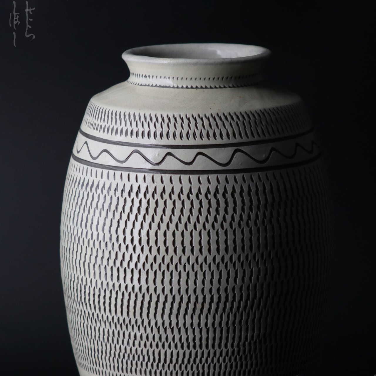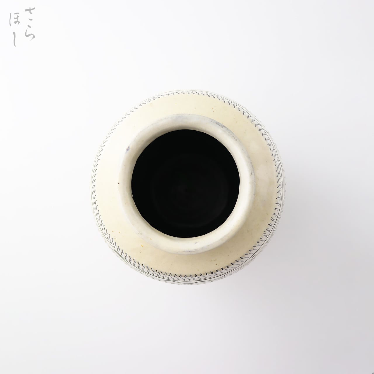 高さ約29cm、直径が約19.5cm、の丸長花瓶で、器の外側全面に小鹿田焼の伝統技法である「飛び鉋(かんな)」を施しています。飛び鉋は、弾力性のある金属で作った鉋を使用し、細かい連続的な削り目をつけ模様をつける技法です。さらに、中段付近に木材で波線を描く「櫛描き」を加えてアクセントを付けています。白色のスマートなフォルムに繊細な柄で女性的な優美なイメージです。