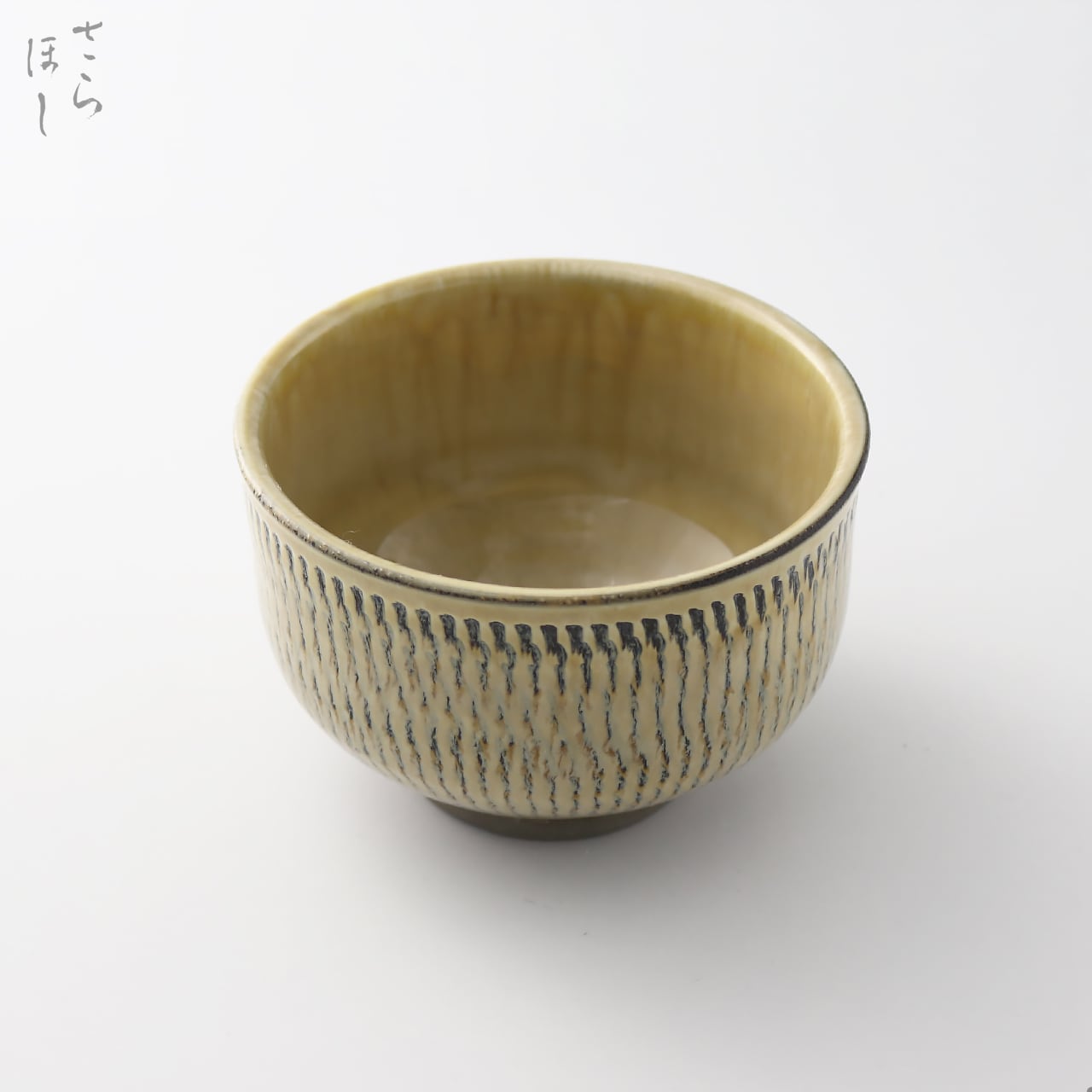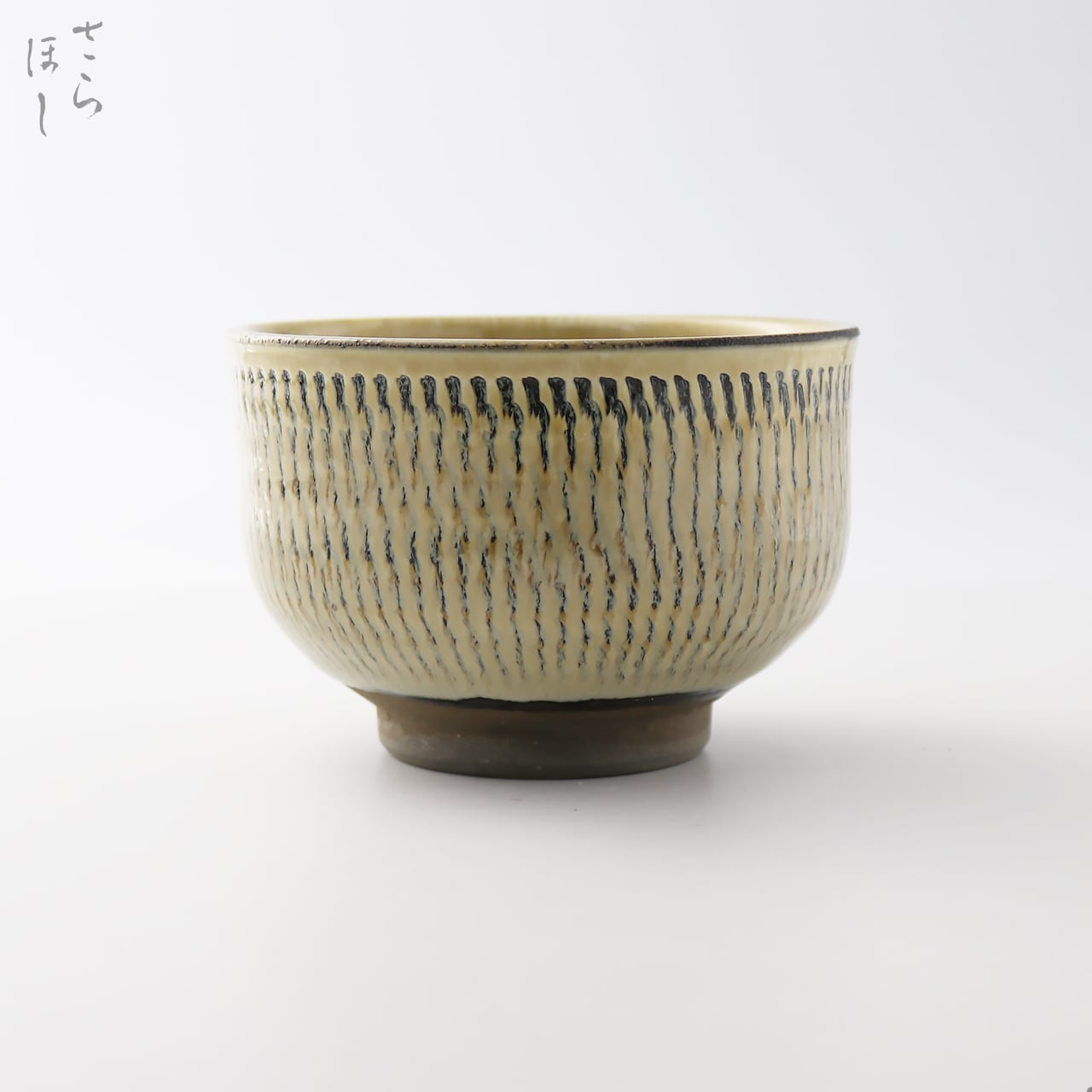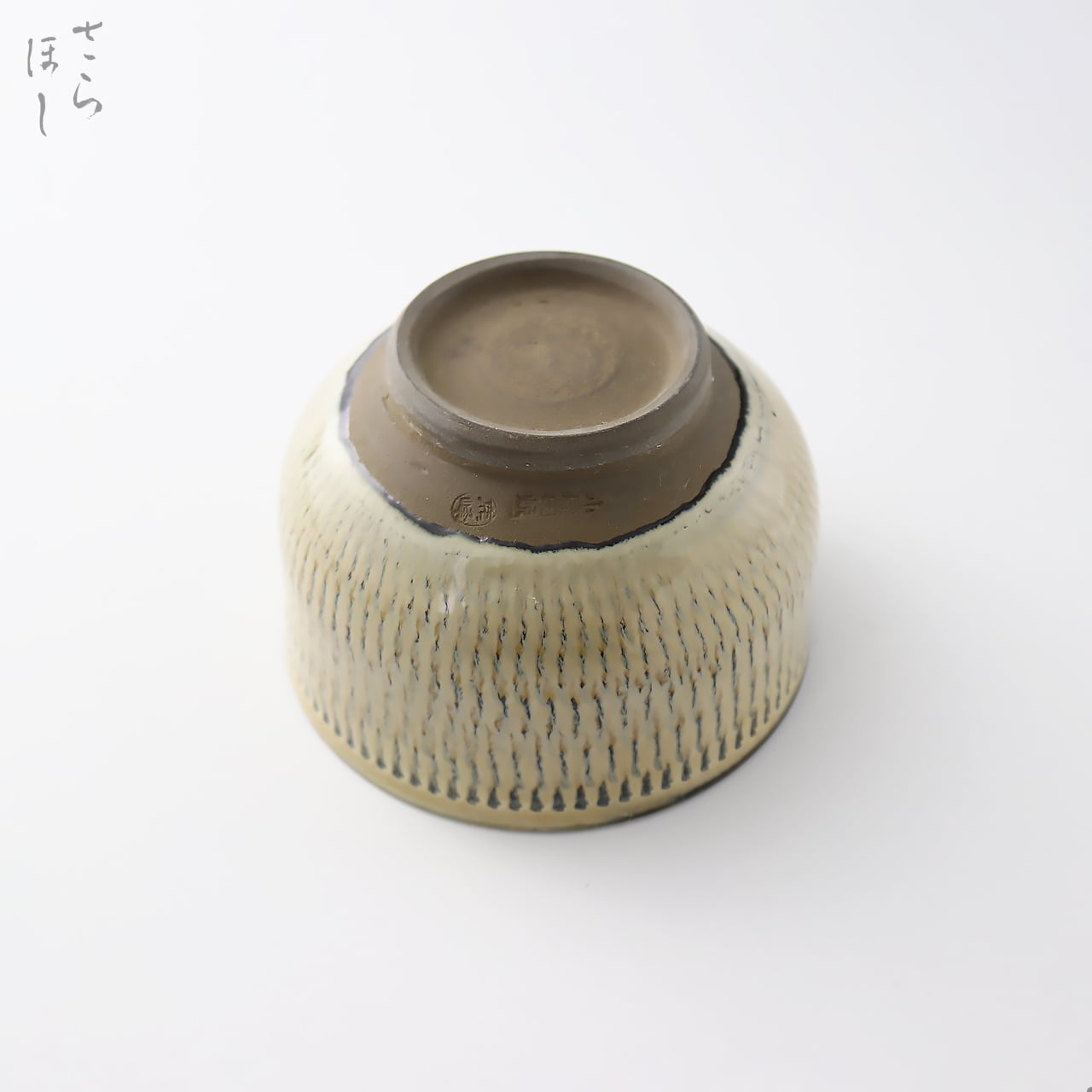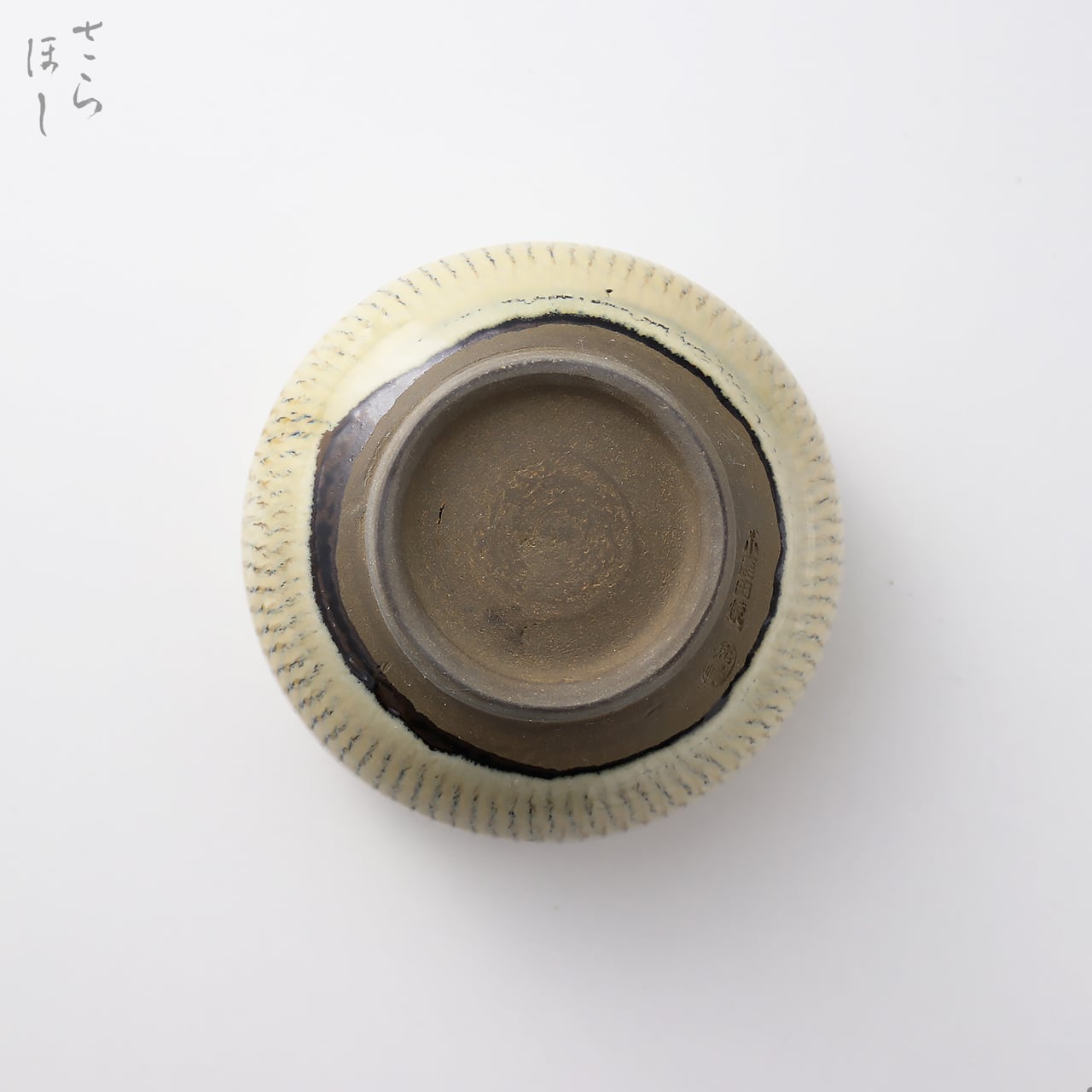 器の外側に小鹿田焼の伝統技法である「飛び鉋(かんな)」を施しています。成形した器に白化粧土を掛け、足で蹴って回す蹴轆轤に乗せて、弾力性のある金属で作った鉋を押し当てて細かい連続的な削り目をつけ模様をつける技法です。