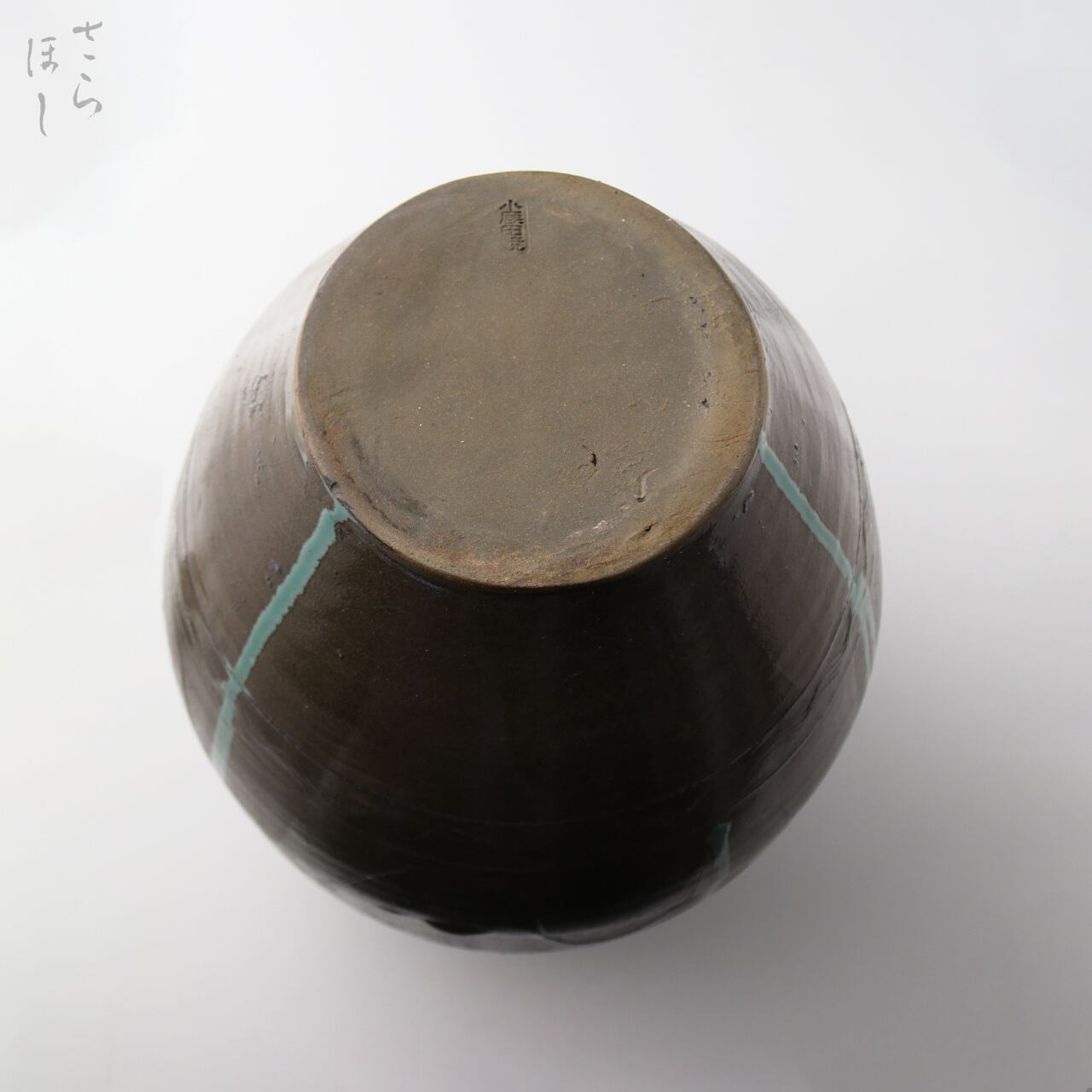直径が約27.5cmの丸花瓶で、器の外側に小鹿田焼の伝統技法である木材で波線を描く「櫛描き」が描かれています。また、釉薬を柄杓にくみ、水をまくような動作で作品に掛ける技法「打ち掛け」が即興的な面白さを演出しています。花器として使用の他、インテリアとしてもおすすめです。
