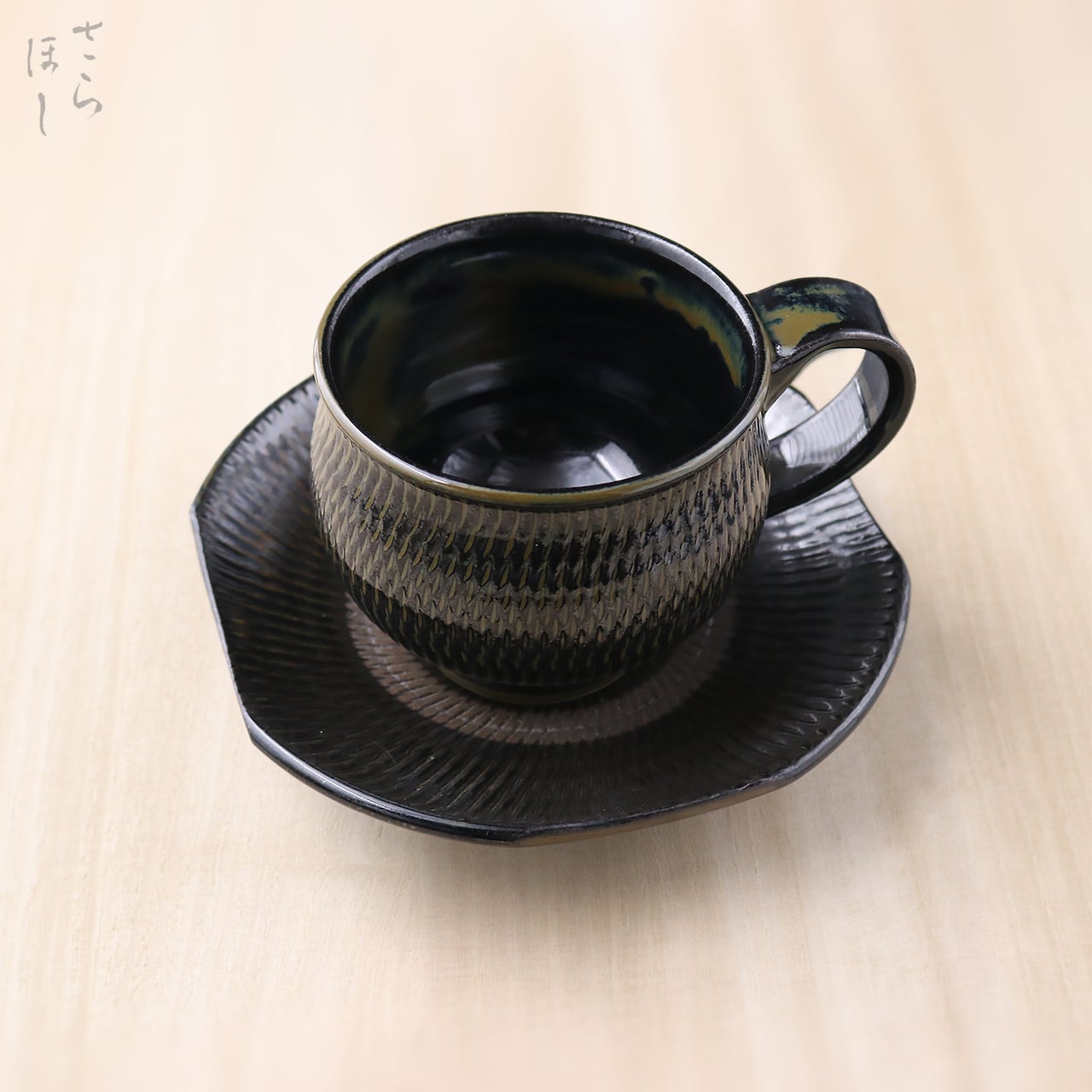 直径が約8.5cmのマグカップです。容量が多く、コーヒーやスープにもおすすめです。ソーサーは約幅15.5cmサイズの角皿を合わせました。一般的な丸い器に対し、角皿は雰囲気が違って見えます。個性的な演出がお好きな方に。お皿はスイーツや副菜の盛り付けの他、取り皿にも使えます。