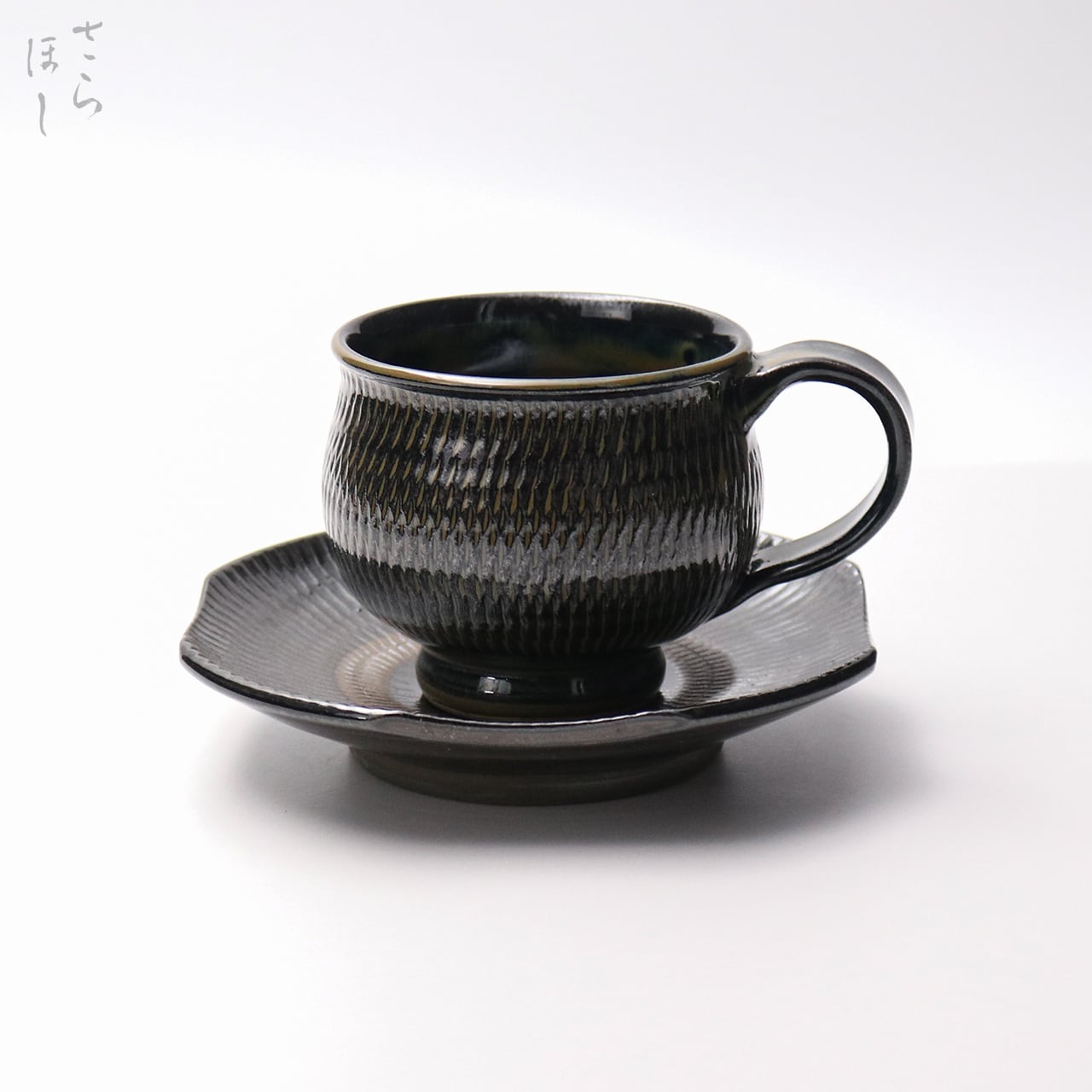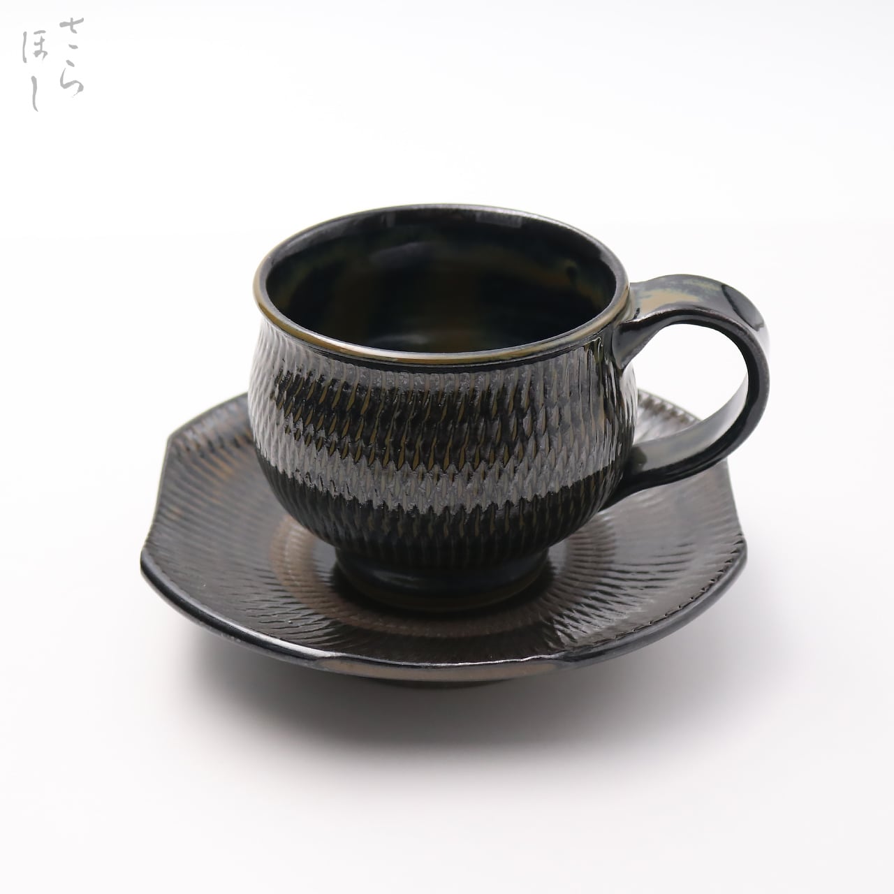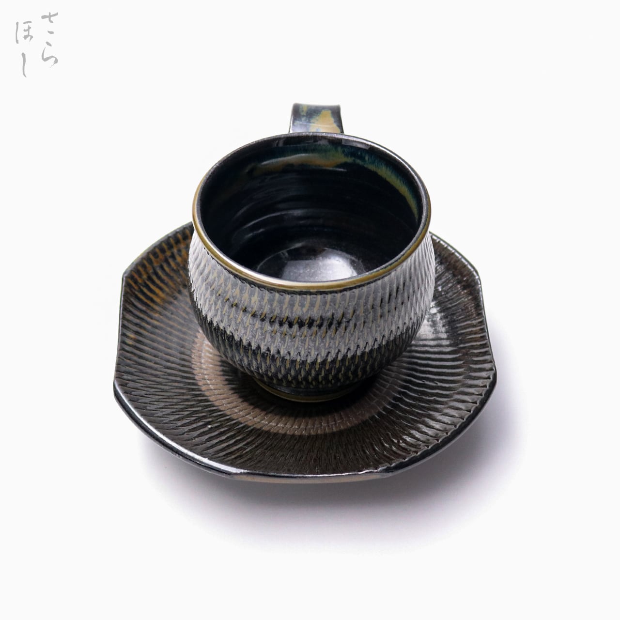 カップ、お皿ともに小鹿田焼の伝統技法である「飛び鉋(かんな)」を施しています。弾力性のある金属で作った鉋を使用し、細かい連続的な削り目をつけ模様をつける技法です。お皿は、一旦丸皿を造り、四方をカットして四角に加工するという手の込んだ作りになっています。