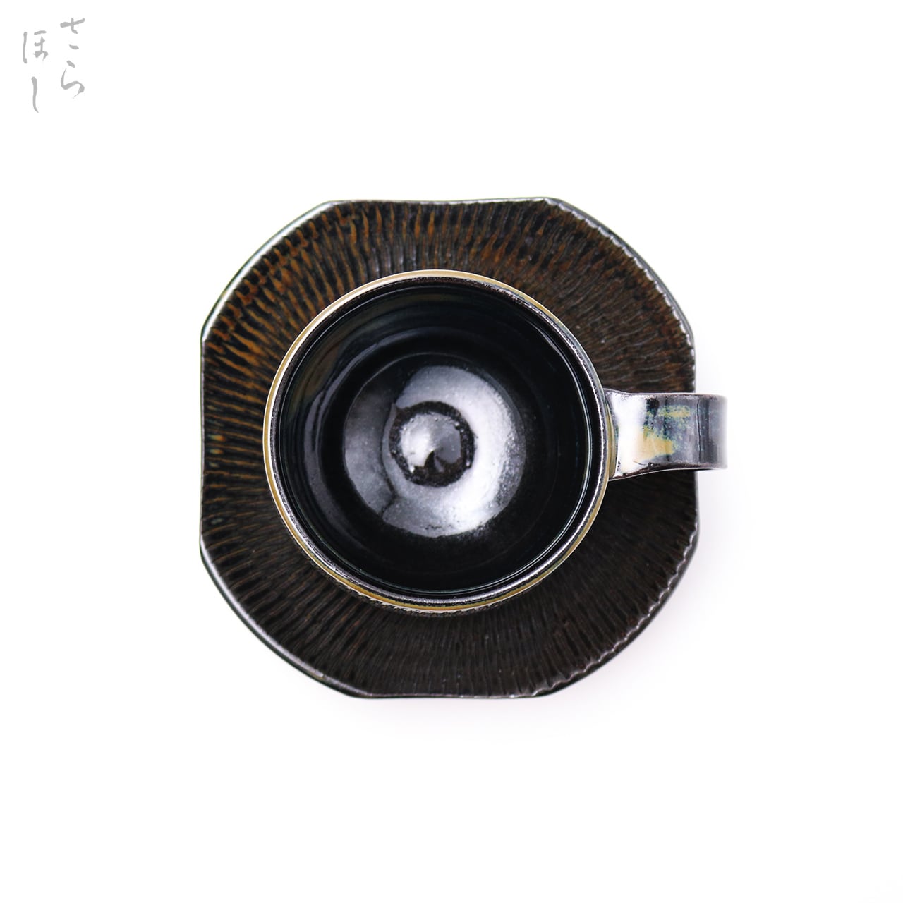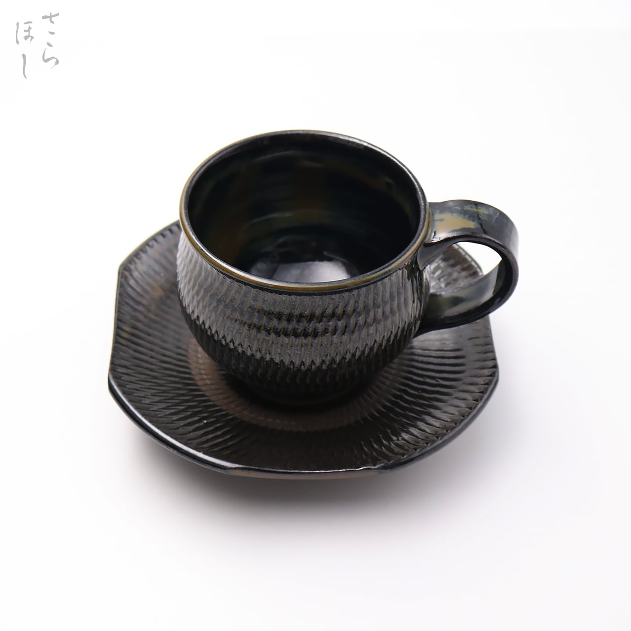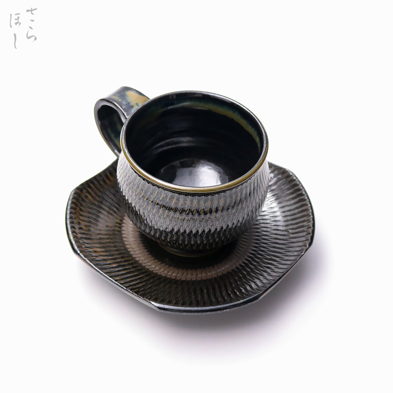 カップ、お皿ともに小鹿田焼の伝統技法である「飛び鉋(かんな)」を施しています。弾力性のある金属で作った鉋を使用し、細かい連続的な削り目をつけ模様をつける技法です。お皿は、一旦丸皿を造り、四方をカットして四角に加工するという手の込んだ作りになっています。