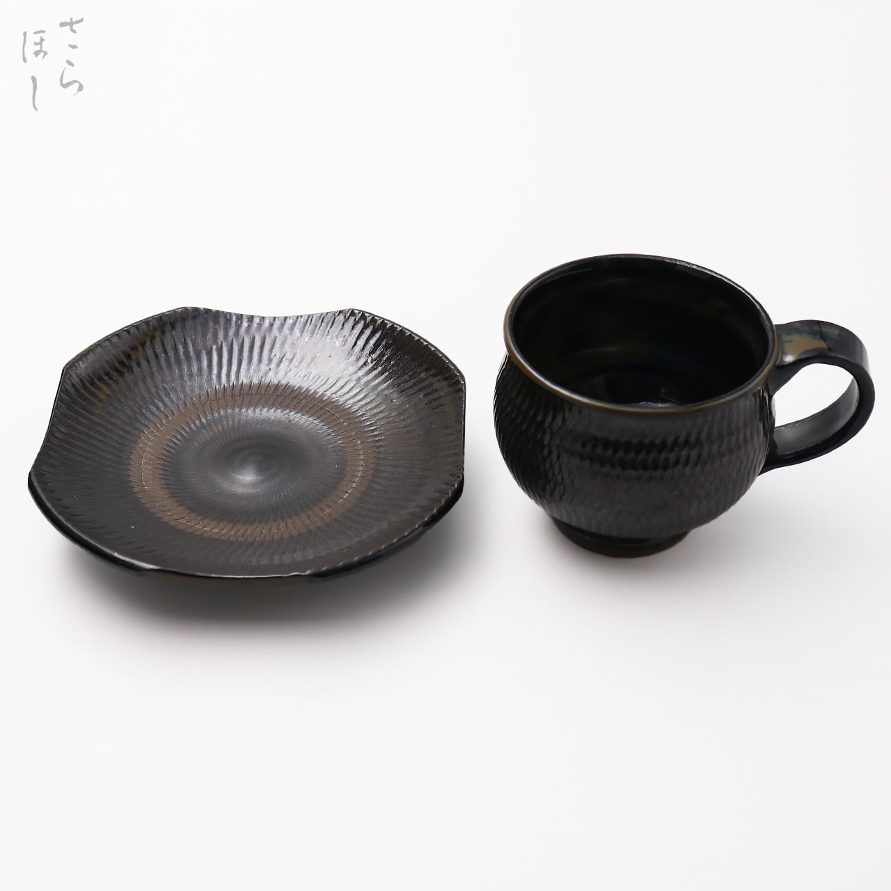 小鹿田焼 小袋窯【マグカップ&5寸角皿セット】飛びかんな 真黒 陶器 和食器 民藝