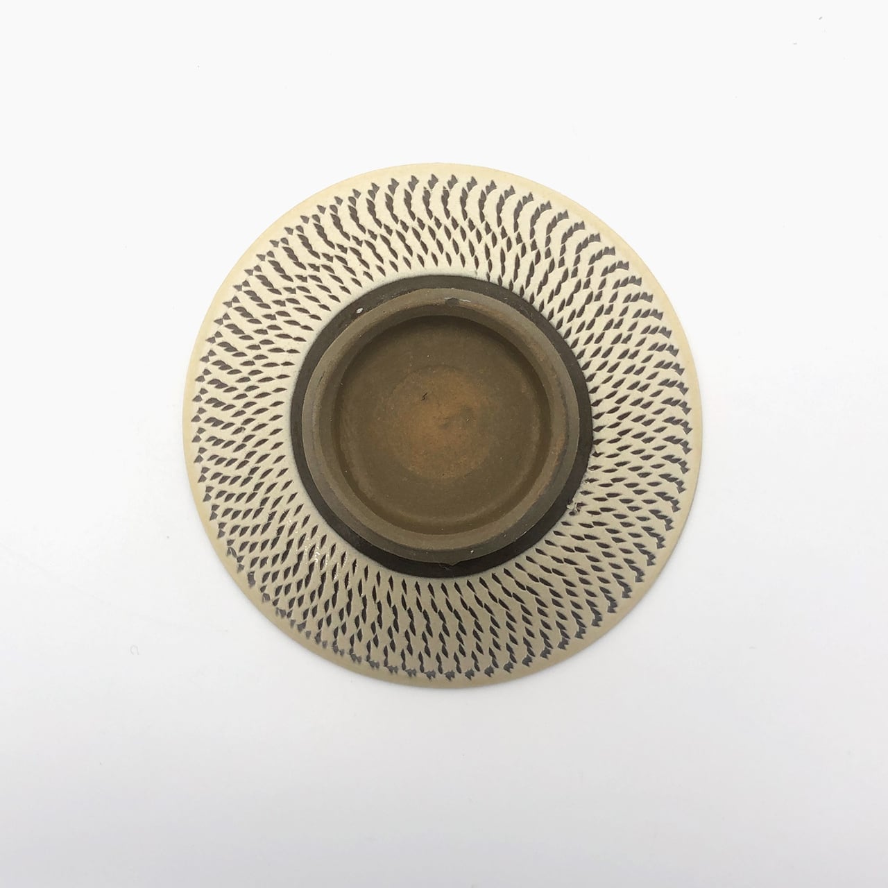 ・お皿等、窯で重ねて焼くものには、中央付近に白い円(目剥ぎ)があるものと無いものがあります。ご注文の際は目剥ぎの有無をご指定いただけません。ご了承ください。重なった部分がくっついてしまわないよう、釉薬を剥がした跡が白い円となって現れたものす。一番上で焼かれたものや、重ねずに焼かれたものには目剥ぎがありません。