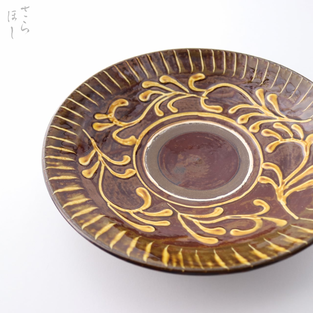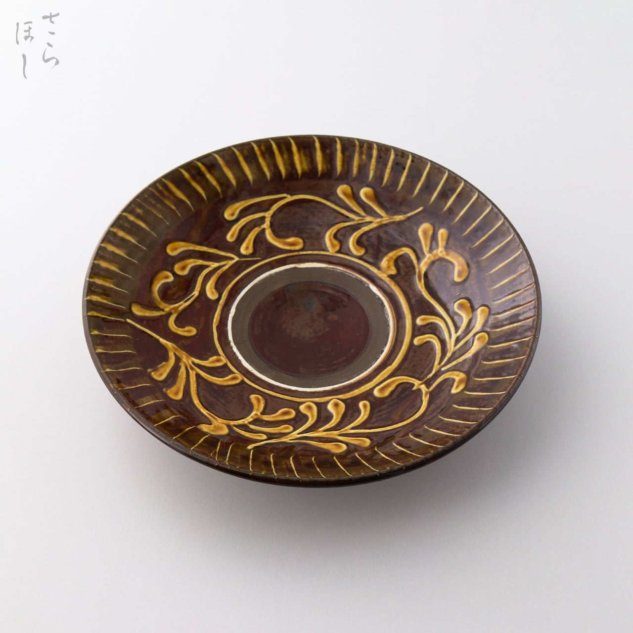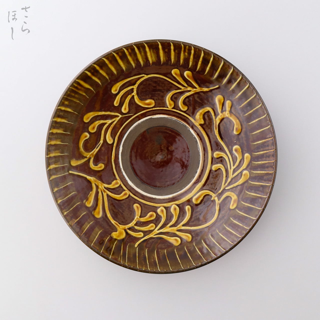器の縁に小鹿田焼の伝統技法である「打ち刷毛目(はけめ)」を施しています。足で蹴って回す蹴轆轤に乗せ、刷毛を連続的な打ち付けて模様をつける技法です。さらに内側にイッチンで図柄が描かれています。イッチン描きは小鹿田ではポン描きといわれ、スポイトのような道具に化粧土を入れ、口から絞り出して素地に盛るように立体的な文様を描いていく技法です。