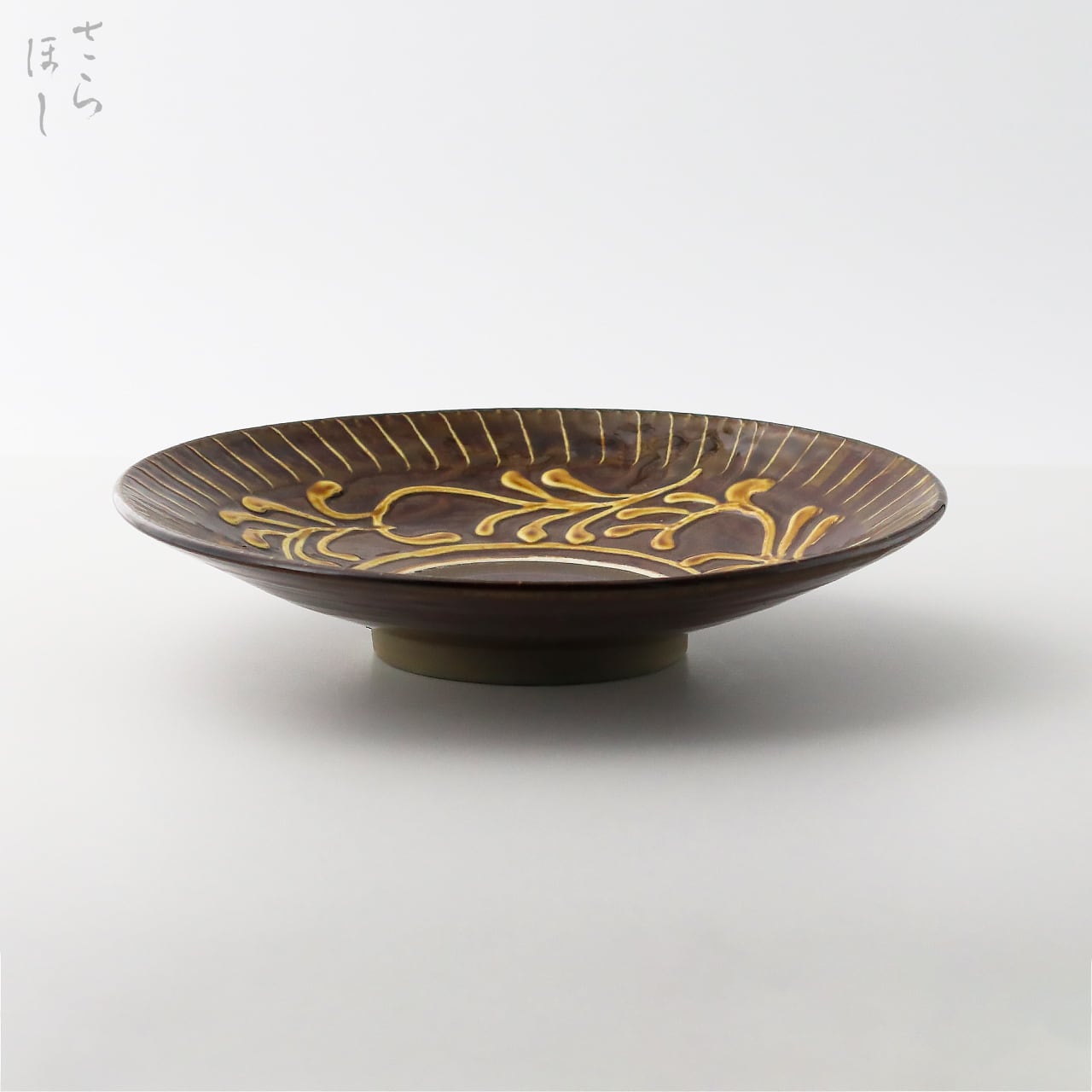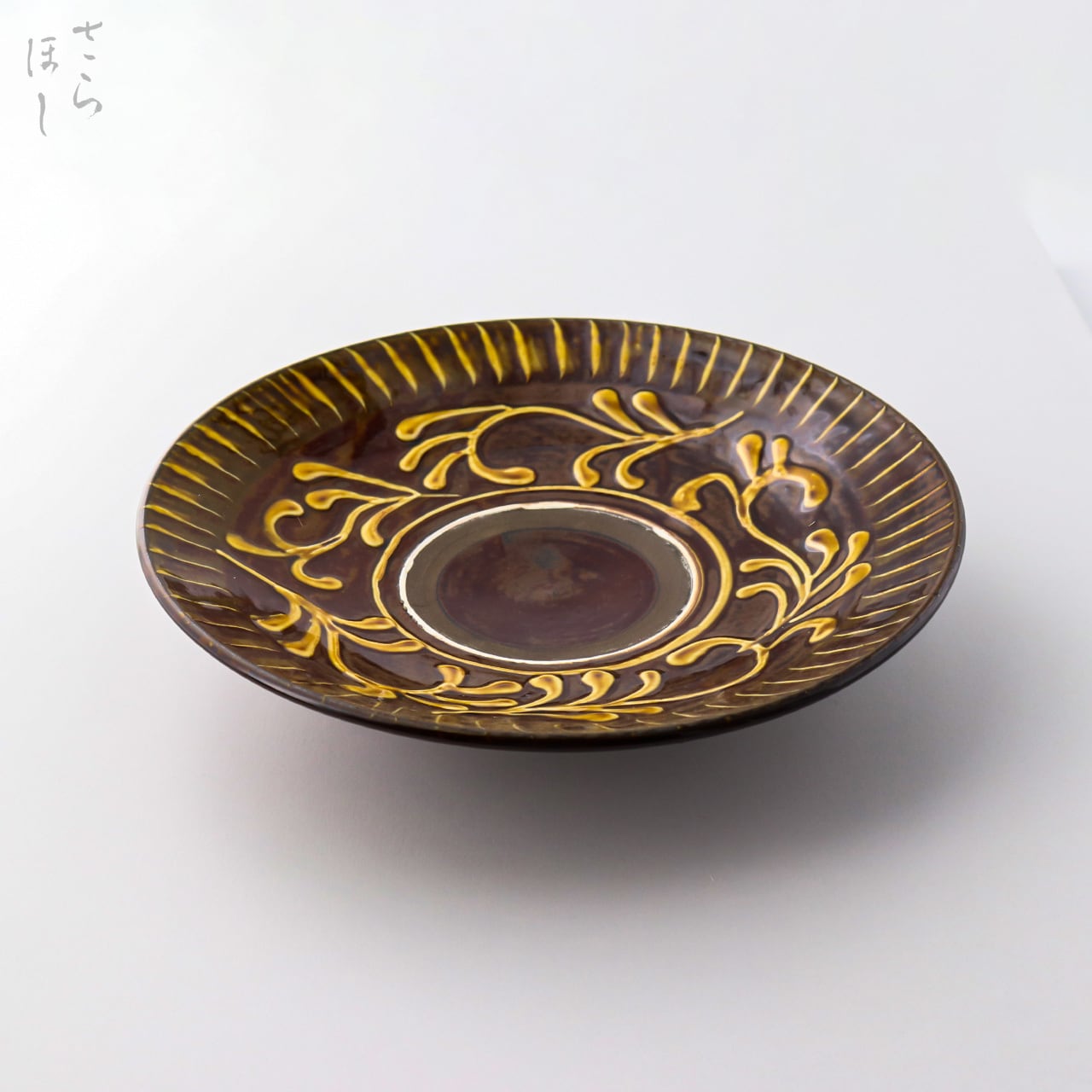 小鹿田焼 小袋窯 8寸皿 打ち刷毛目/イッチン 茶 幅約23cm カレー皿 大皿 陶器 和食器 民藝