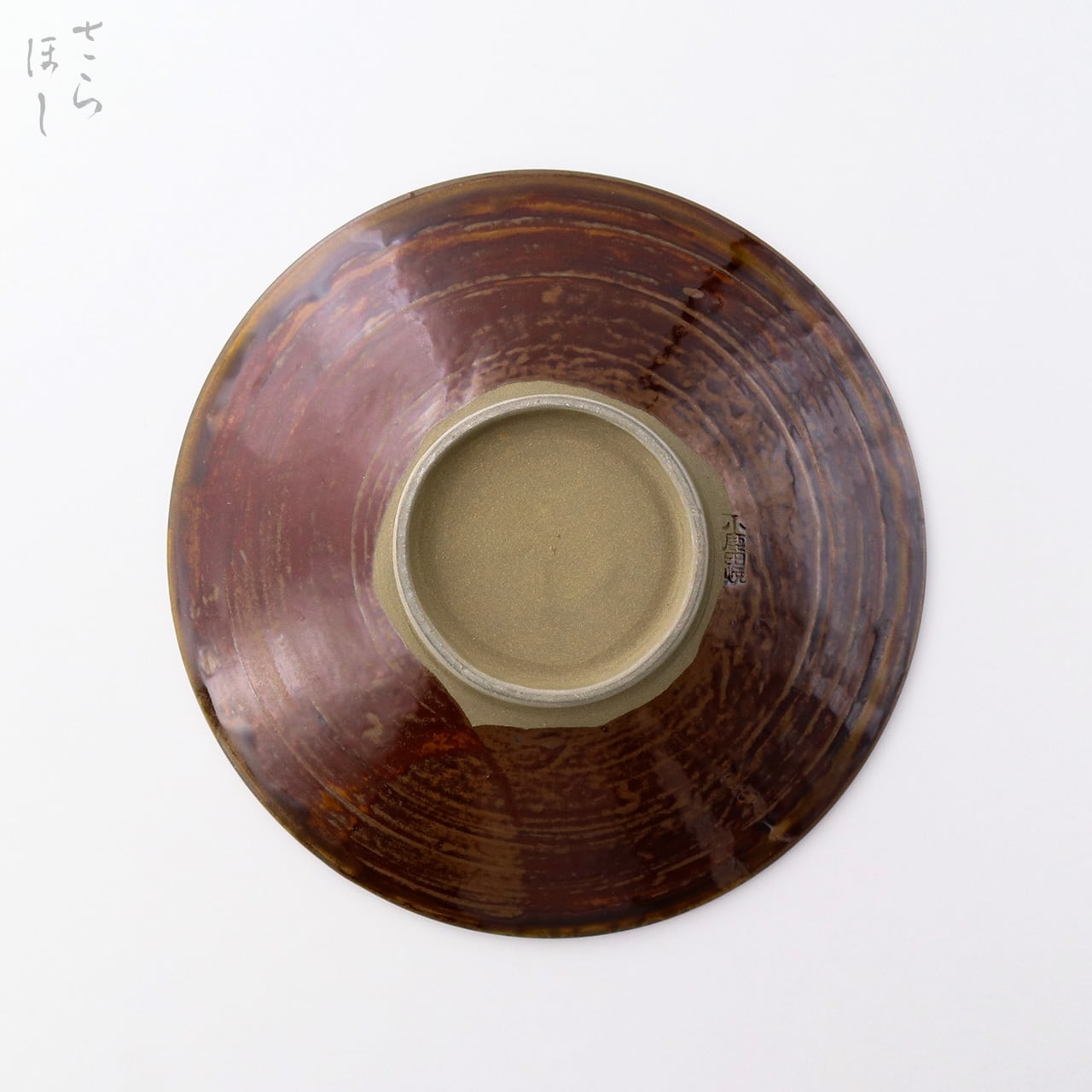小鹿田焼はお皿等を複数枚重ねて焼きます。その際、重なった部分がくっついてしまわないよう、釉薬を剥がした跡が白い円(目剥ぎ)となって現れます。一番上で焼かれたものは目剥ぎがありません。目剥ぎは、兄弟窯の小石原焼にはなく、小鹿田焼の特徴のひとつでもあります。ご注文の際は目剥ぎの有無をご指定いただけません。ご了承ください。