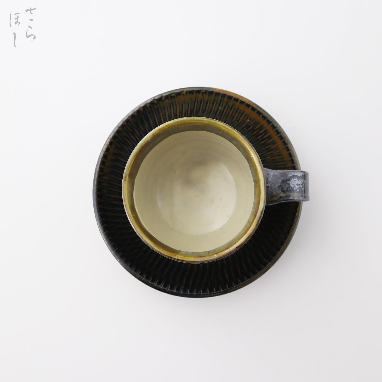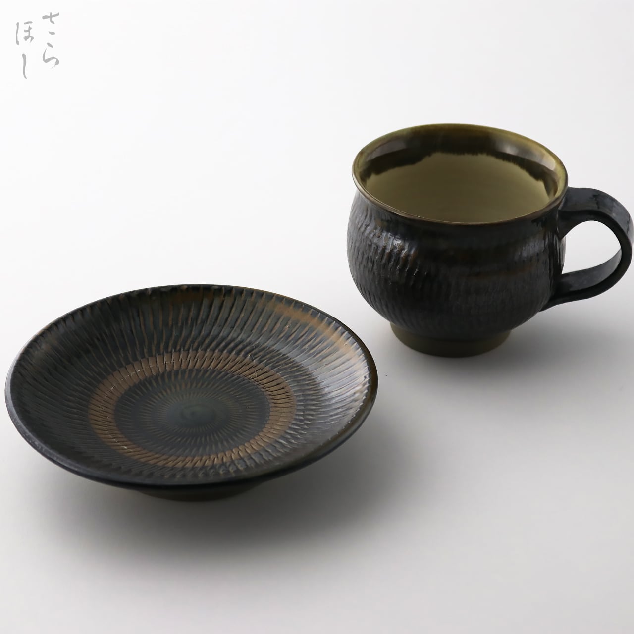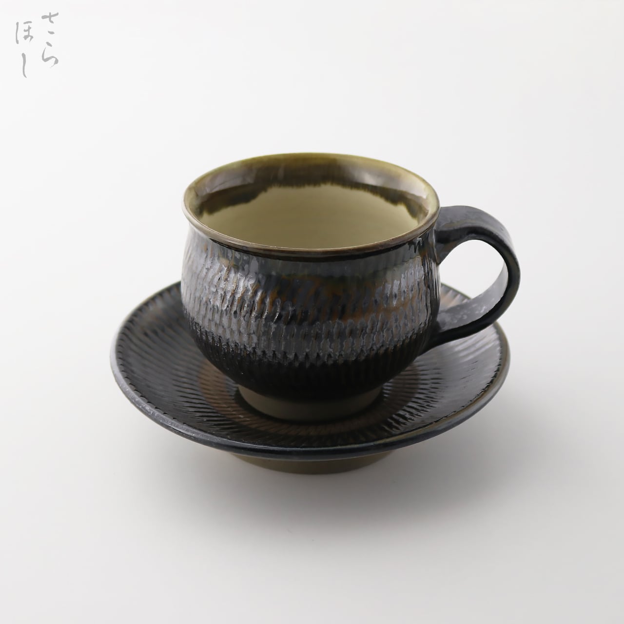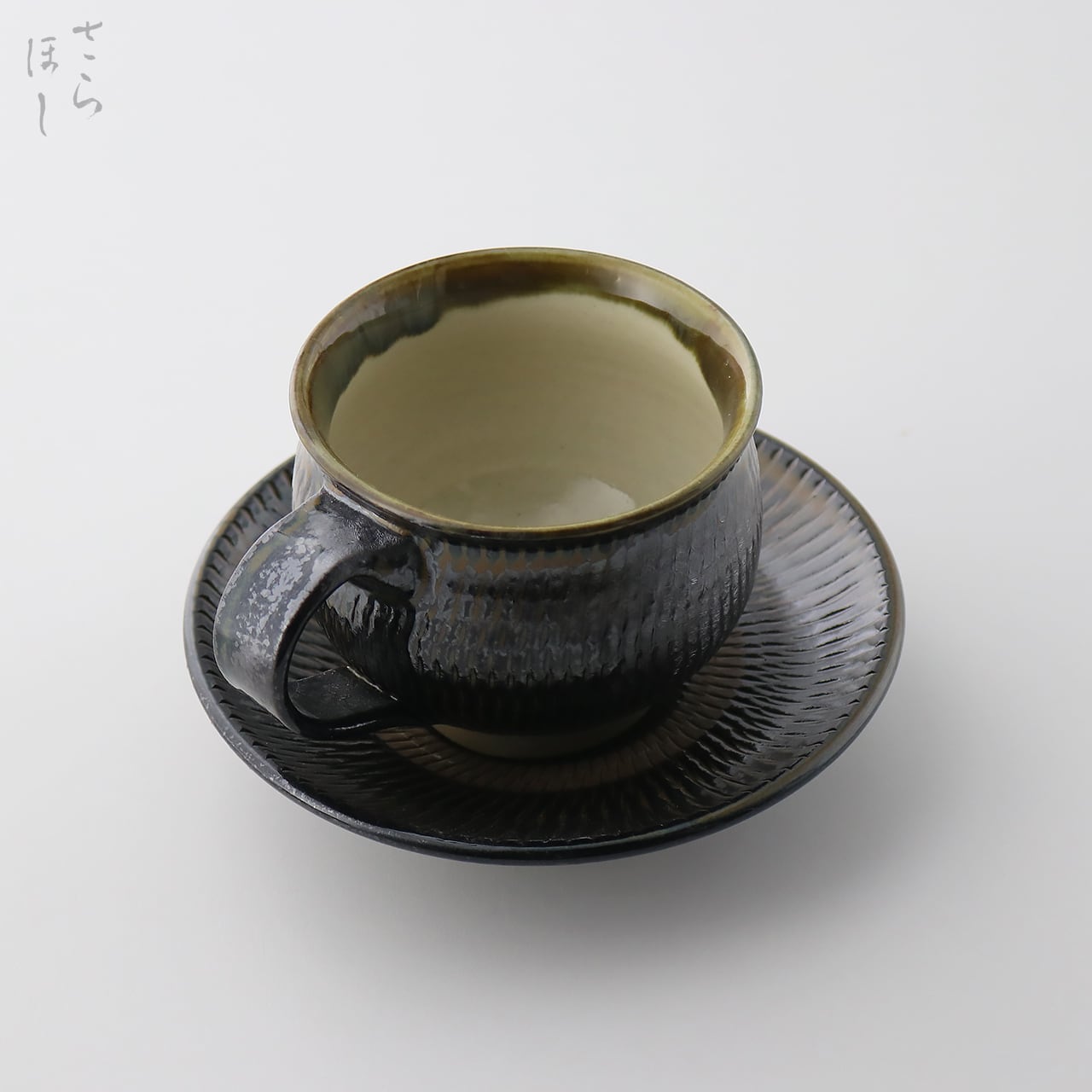 小鹿田焼 小袋窯【コーヒーカップ&ソーサーセット】飛びかんな 真黒 陶器 和食器 民藝