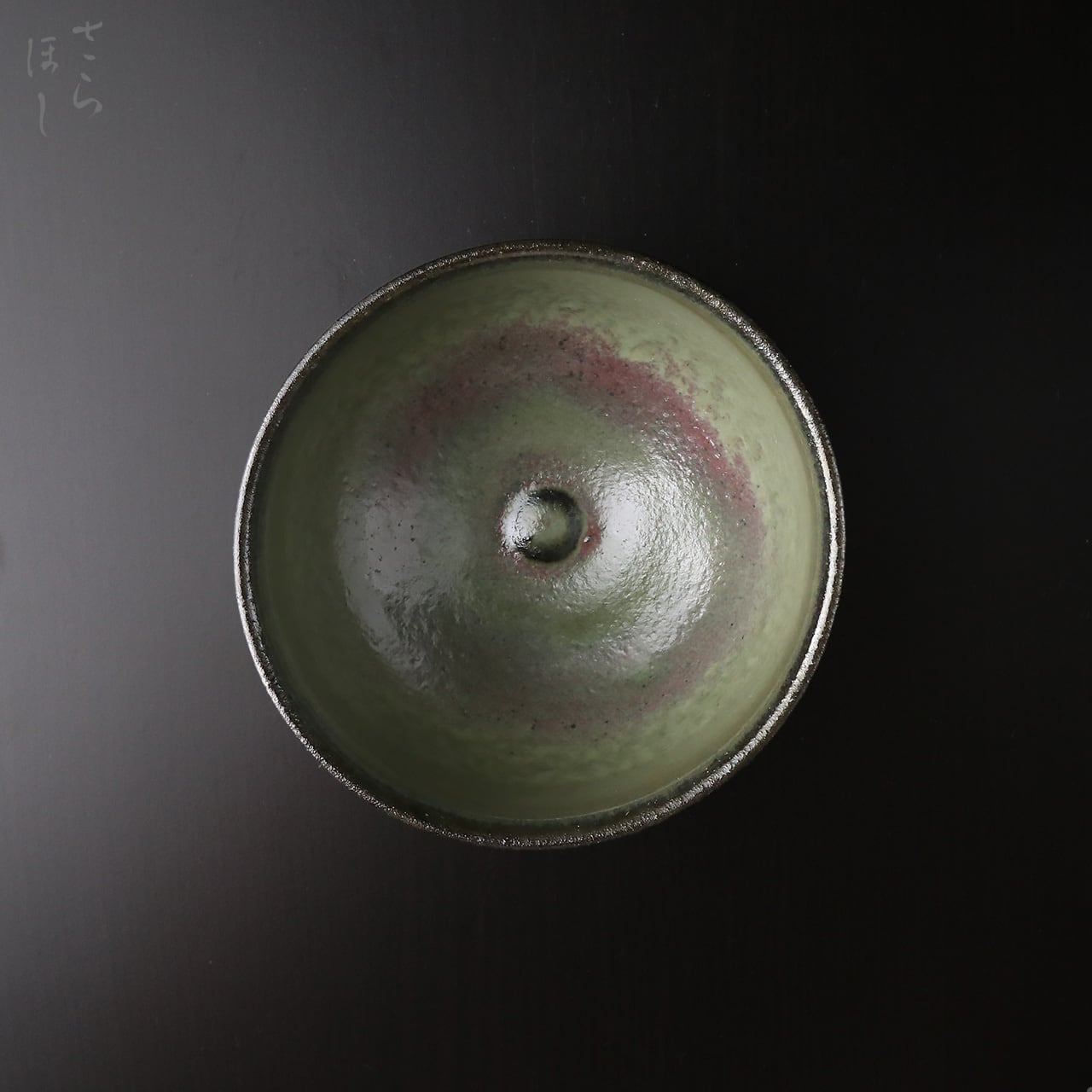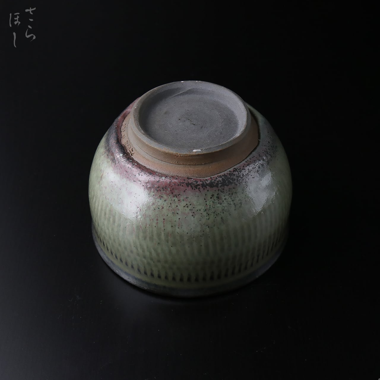 飛び鉋の装飾後、青磁釉が施釉され、登り窯の炎で内外に溶け流れて、美しい緑で器を彩っています。高台付近には溶けて流れた釉が立体的に溜まり、また、窯変で部分的に赤みを帯びているところも見どころです。薪で焚く登り窯の自然な炎が奥深い、唯一無二の表情を作り出してくれました。