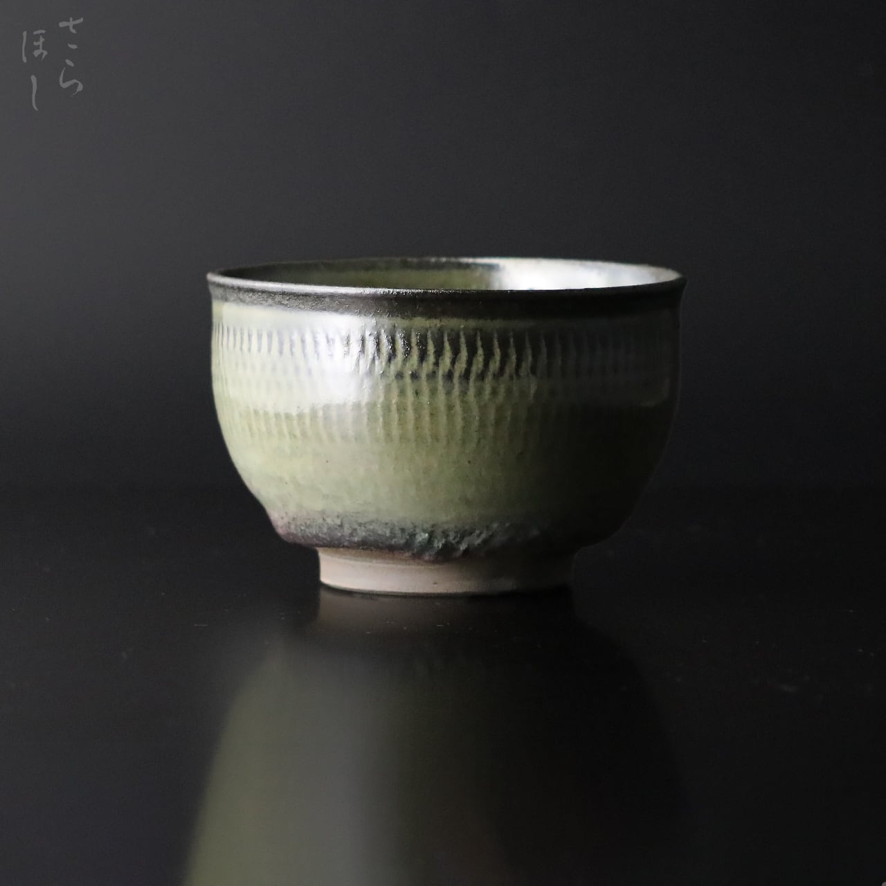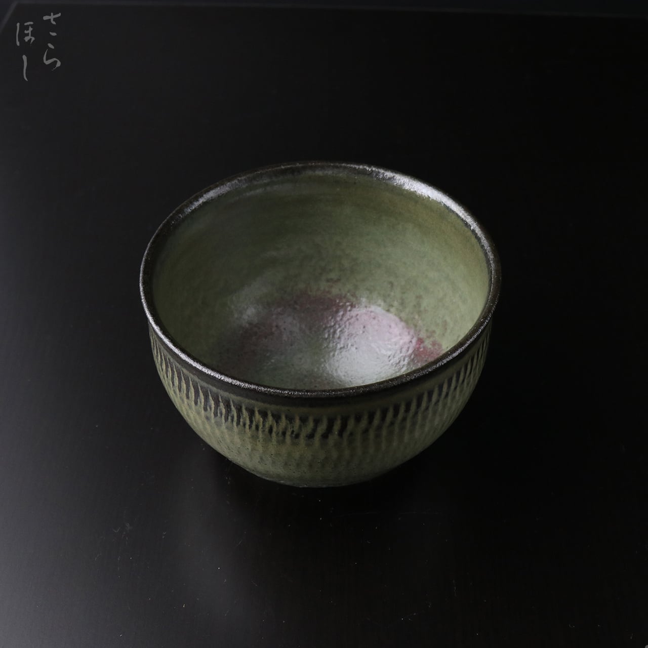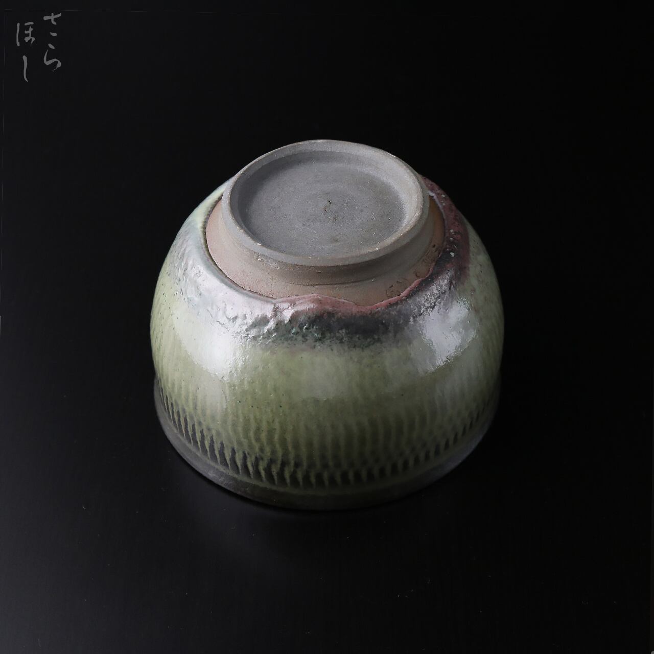 小鹿田焼 小袋窯 抹茶碗 銘 鹿峰 地飛びかんな 緑 口径約12cm 陶器 茶道具 民藝