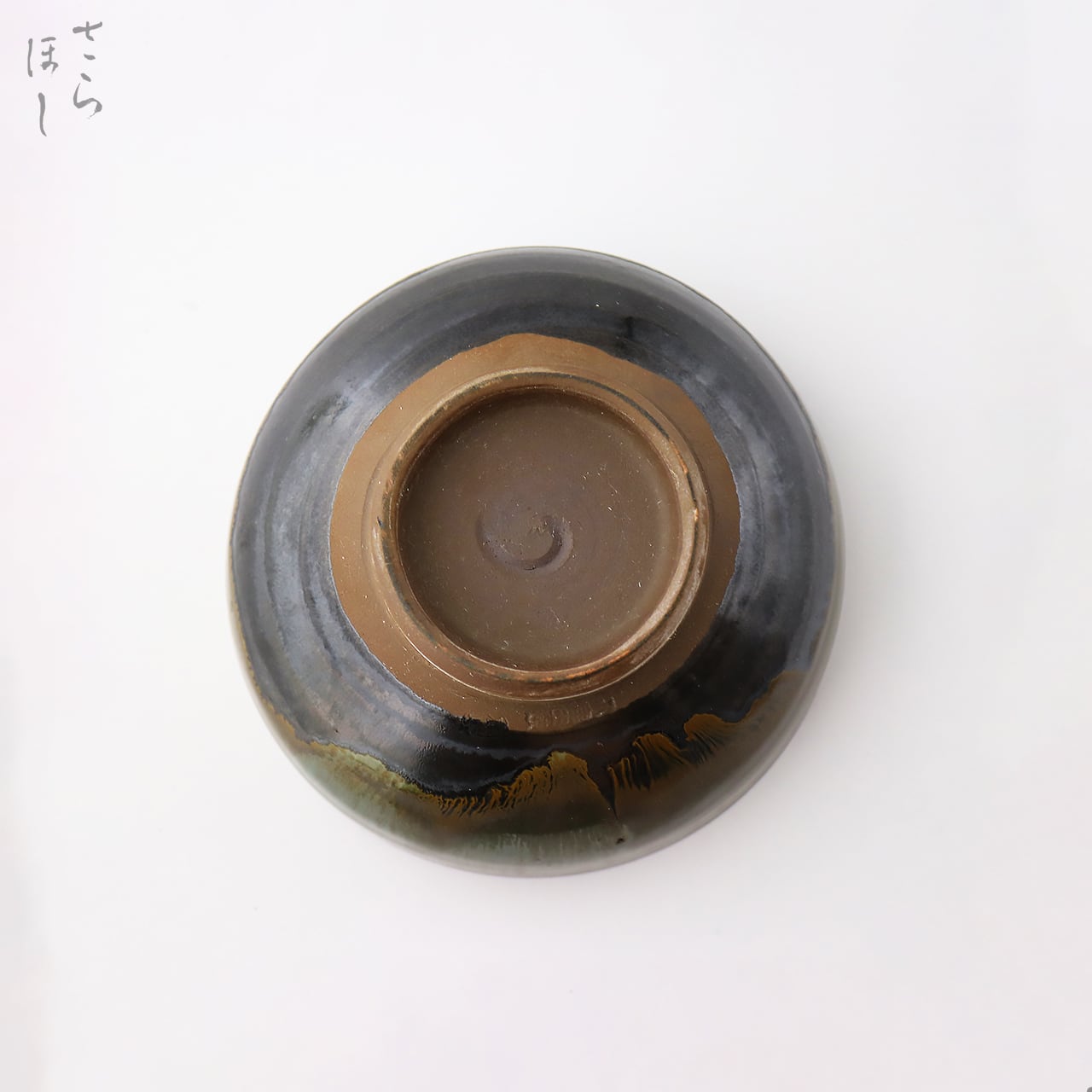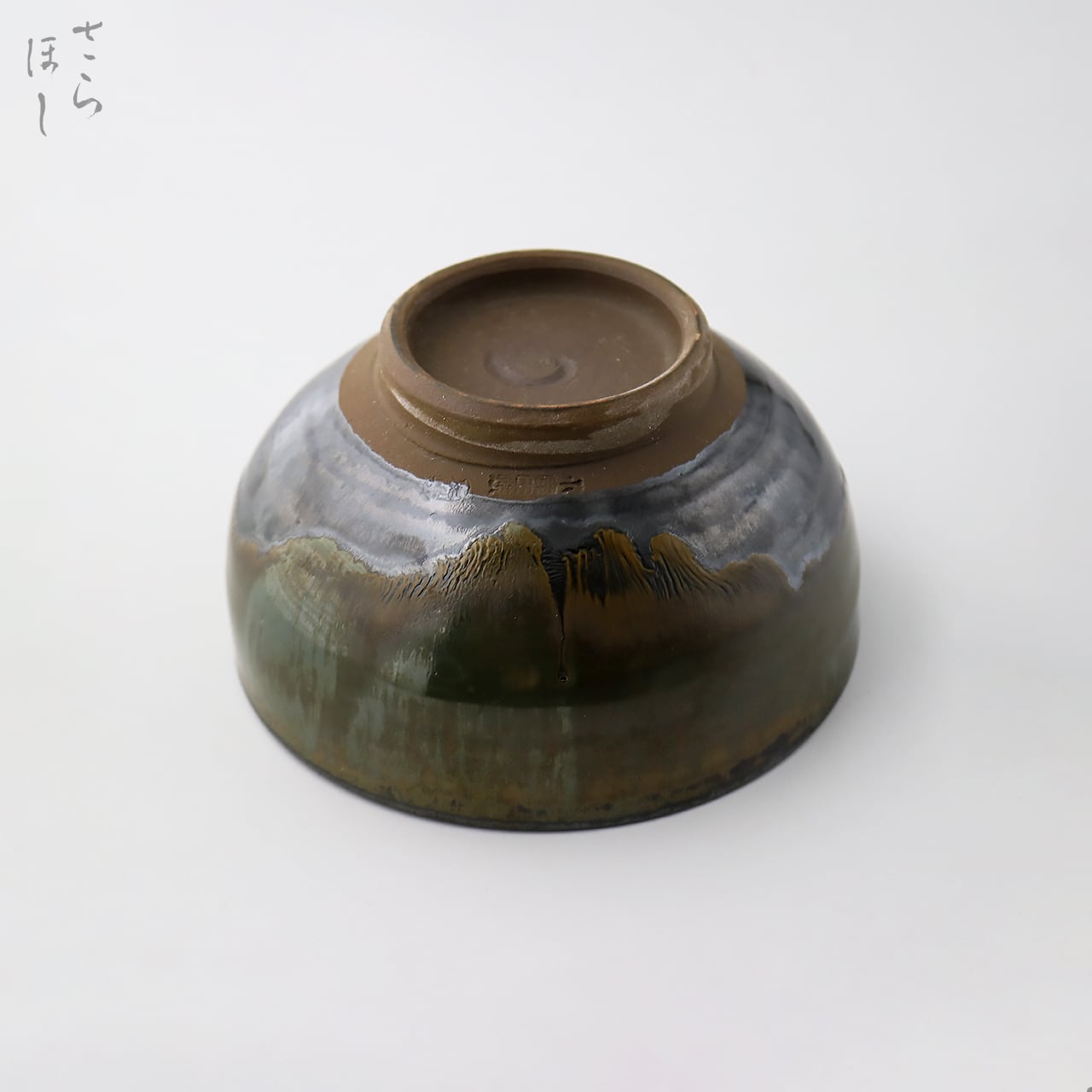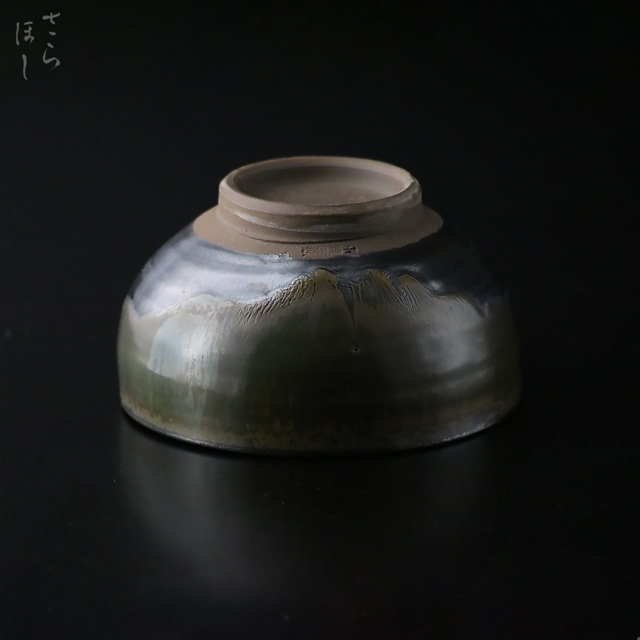 抹茶碗はお茶をいただいた後に茶碗を鑑賞するという所作があり、作り手の拘りが注ぎ込まれています。地元で採取された材料で作られた真黒釉、青磁釉が登り窯で焼かれ、光沢、立体感のある独特な深みのある景色を描いています。真黒釉の上から青磁釉(緑釉)が登り窯の自然の炎に溶け、口縁から内外になだれ、外側下方では山脈のような見事な風景を描いています。高台部分に銘「鹿峰」が打ってあります。