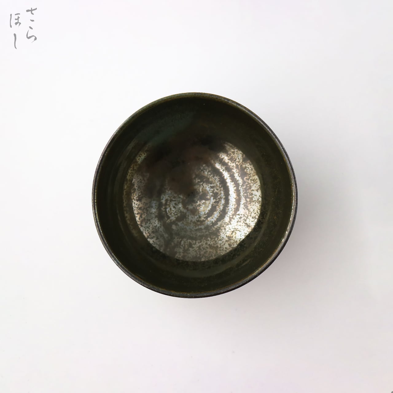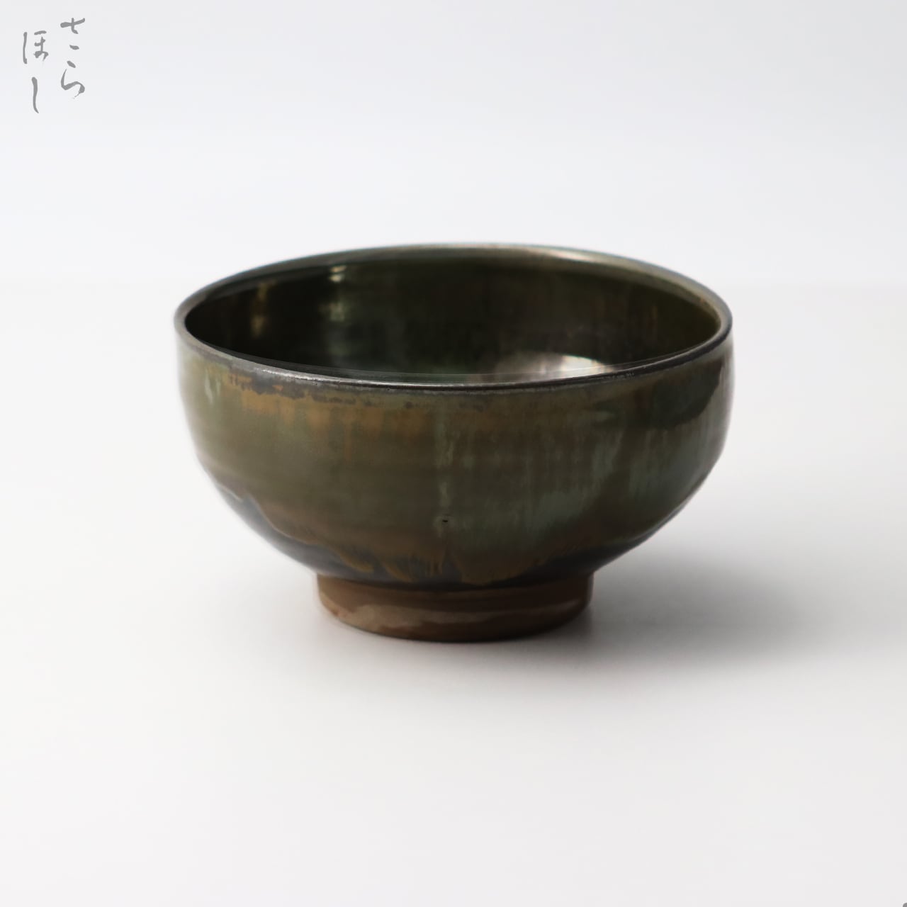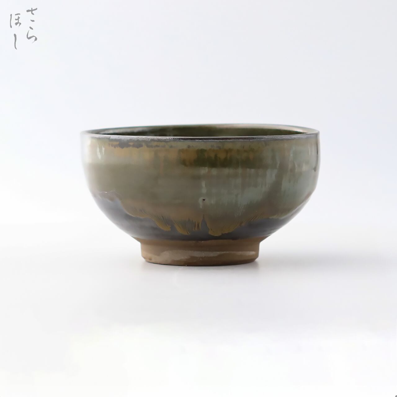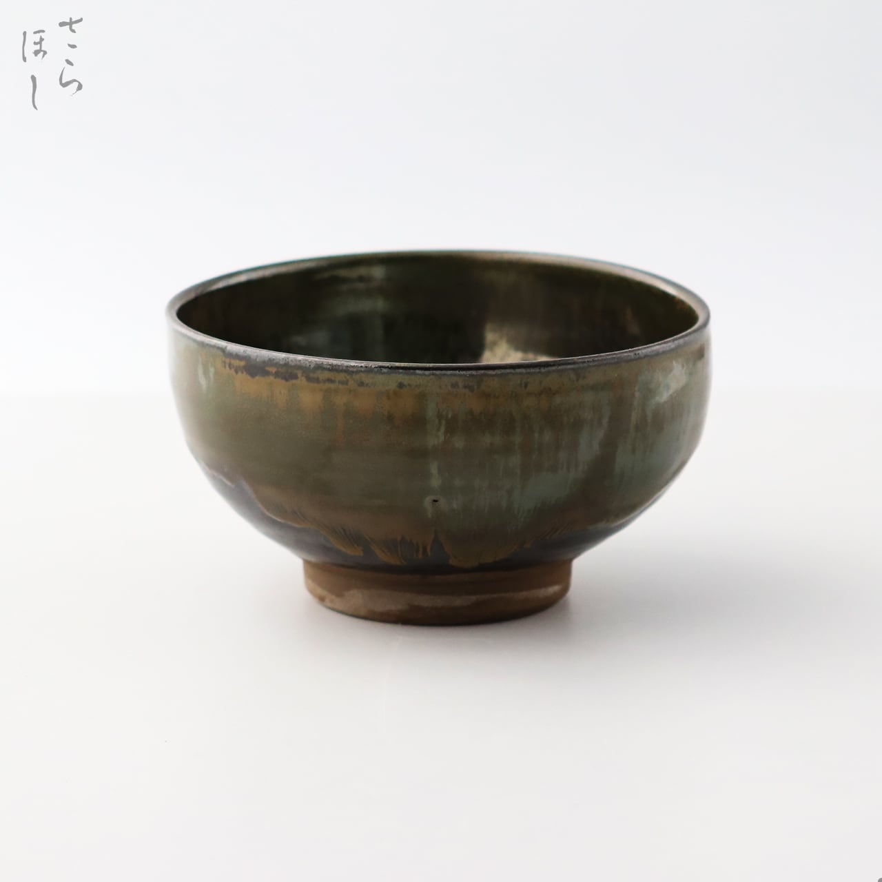 抹茶碗はお茶をいただいた後に茶碗を鑑賞するという所作があり、作り手の拘りが注ぎ込まれています。地元で採取された材料で作られた真黒釉、青磁釉が登り窯で焼かれ、光沢、立体感のある独特な深みのある景色を描いています。真黒釉の上から青磁釉(緑釉)が登り窯の自然の炎に溶け、口縁から内外になだれ、外側下方では山脈のような見事な風景を描いています。高台部分に銘「鹿峰」が打ってあります。