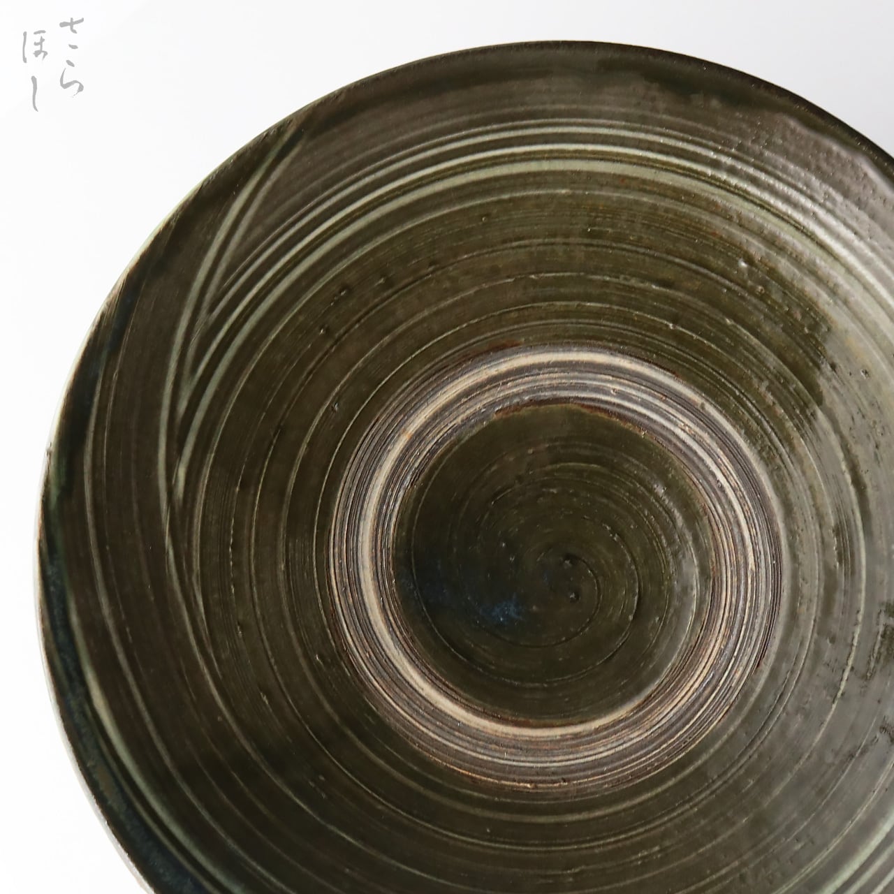 小鹿田焼の伝統技法である「藁引き(わらびき)」を施しています。藁を束ねてブラシ状にしたものを蹴轆轤で回しながら押し当てて模様を描く技法です。