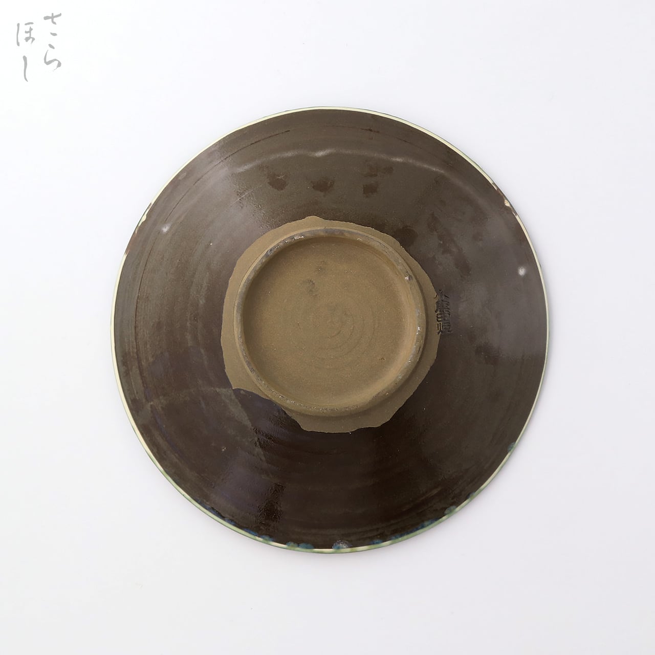 ・お皿等、窯で重ねて焼くものには、中央付近に白い円(目剥ぎ)があるものと無いものがあります。ご注文の際は目剥ぎの有無をご指定いただけません。ご了承ください。重なった部分がくっついてしまわないよう、釉薬を剥がした跡が白い円となって現れたものす。一番上で焼かれたものや、重ねずに焼かれたものには目剥ぎがありません。