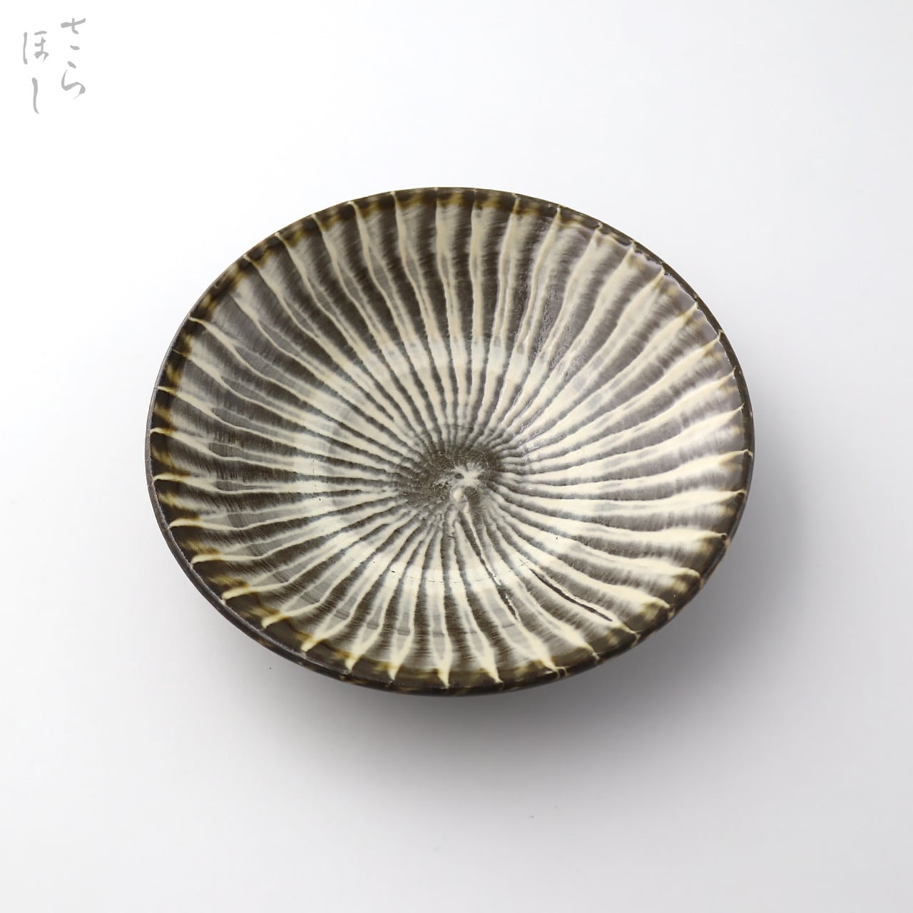 小鹿田焼はお皿等を複数枚重ねて焼きます。その際、重なった部分がくっついてしまわないよう、釉薬を剥がした跡が白い円(目剥ぎ)となって現れます。一番上で焼かれたものは目剥ぎがありません。目剥ぎは、兄弟窯の小石原焼にはなく、小鹿田焼の特徴のひとつでもあります。ご注文の際は目剥ぎの有無をご指定いただけません。ご了承ください。