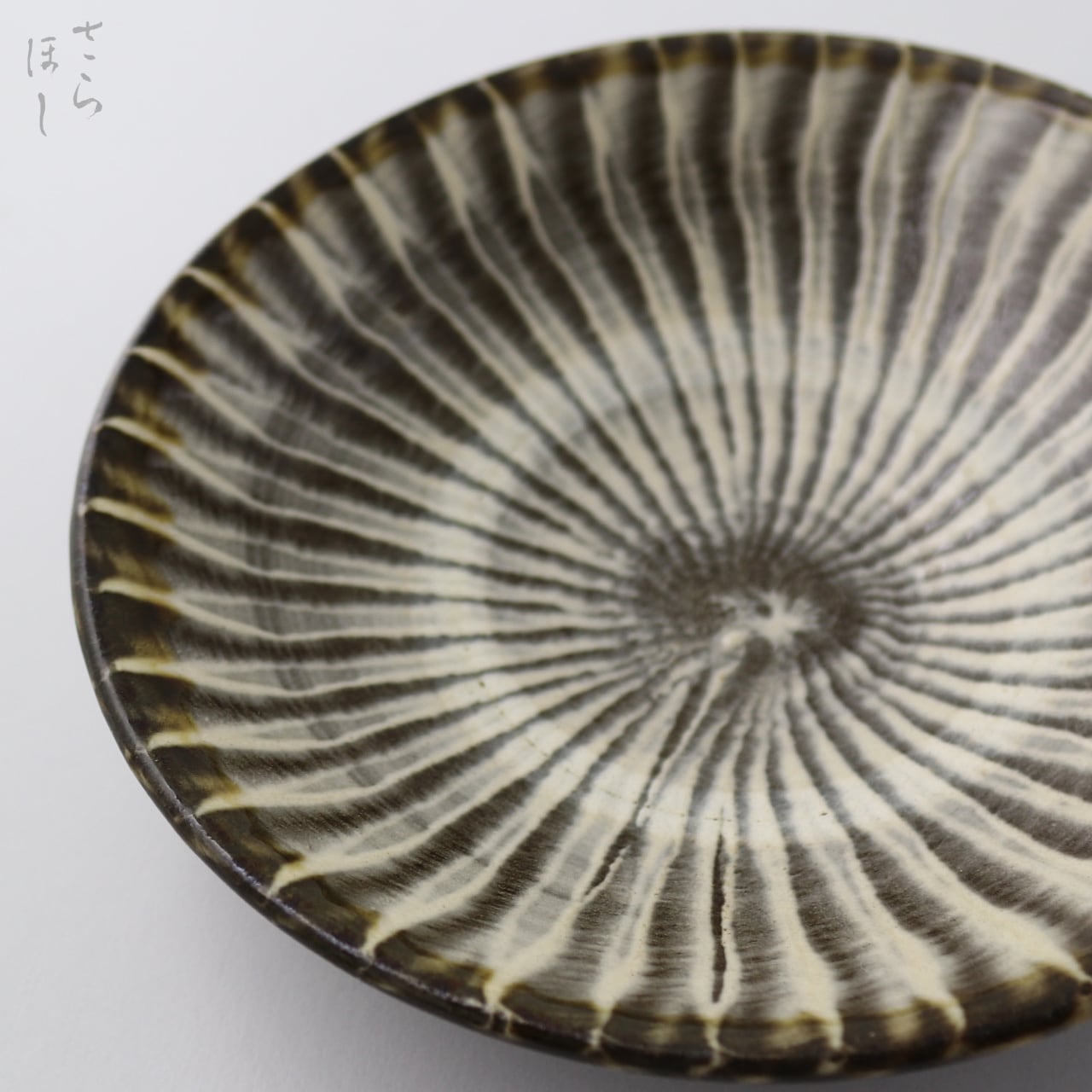 器の内側に小鹿田焼の伝統技法である「打ち刷毛目(はけめ)」を施しています。刷毛を使って白化粧土をぐるりと塗り、連続的な模様をつける技法です。その後で釉薬を掛け、登り窯で焼いています。