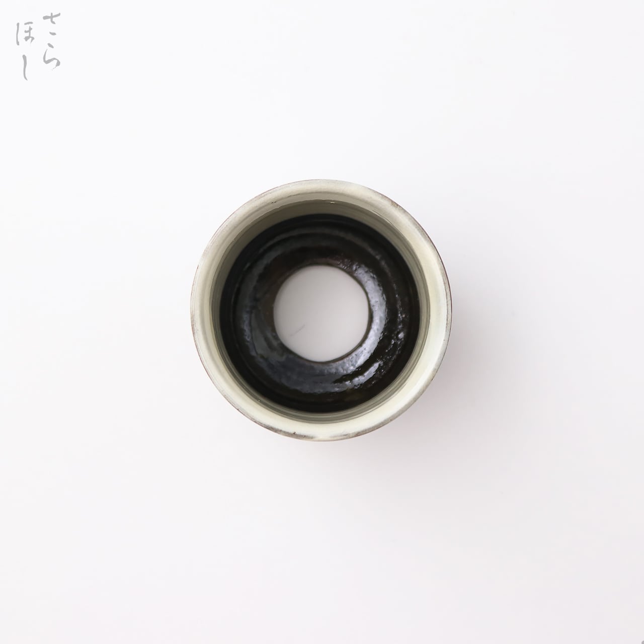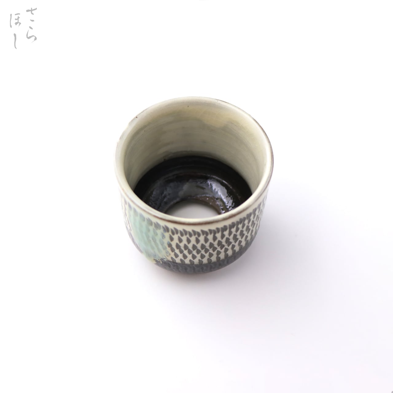 上部に白化粧が掛けられ、小鹿田焼の伝統技法である「飛び鉋(かんな)」を施しています。弾力性のある金属で作った鉋を使用し、細かい連続的な削り目をつけ模様をつける技法です。アクセントに緑釉のドットがひとつ付いています。