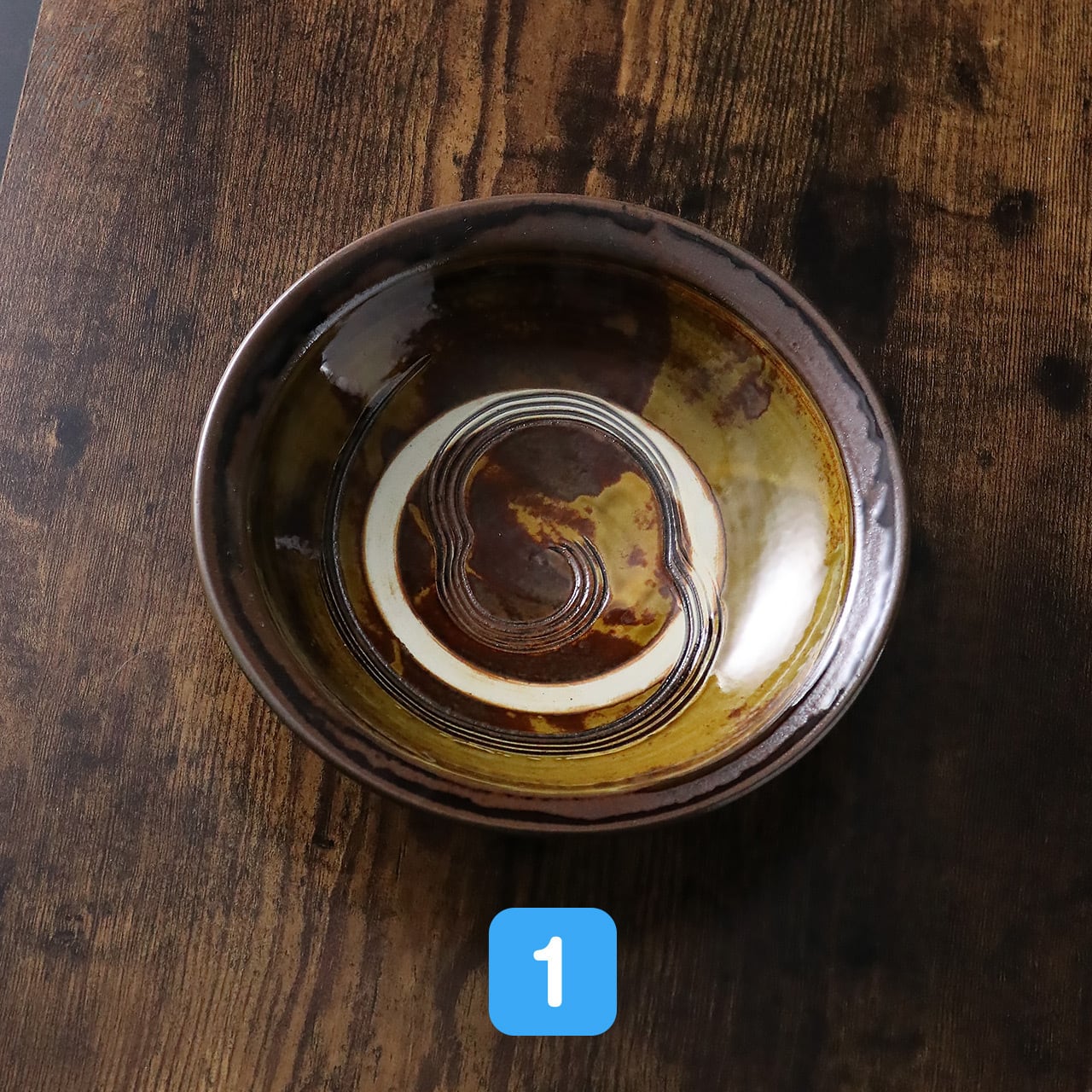 器の内側に小鹿田焼の伝統技法である「櫛描き(くしがき)」を施しています。櫛描きは、木材を使って波線を描く技法です。櫛で削られて表れた土の部分が登り窯の炎で焼かれて褐色になって模様を描きます。ここでは登り窯の炎が釉薬を焼いて描いた斑文の上に、櫛描きで渦がバランスよく描かれています。螺旋は世界中で古くから見られる文様で、一般的に循環する無限の生命、輪廻転生の思想を表しているそうです。