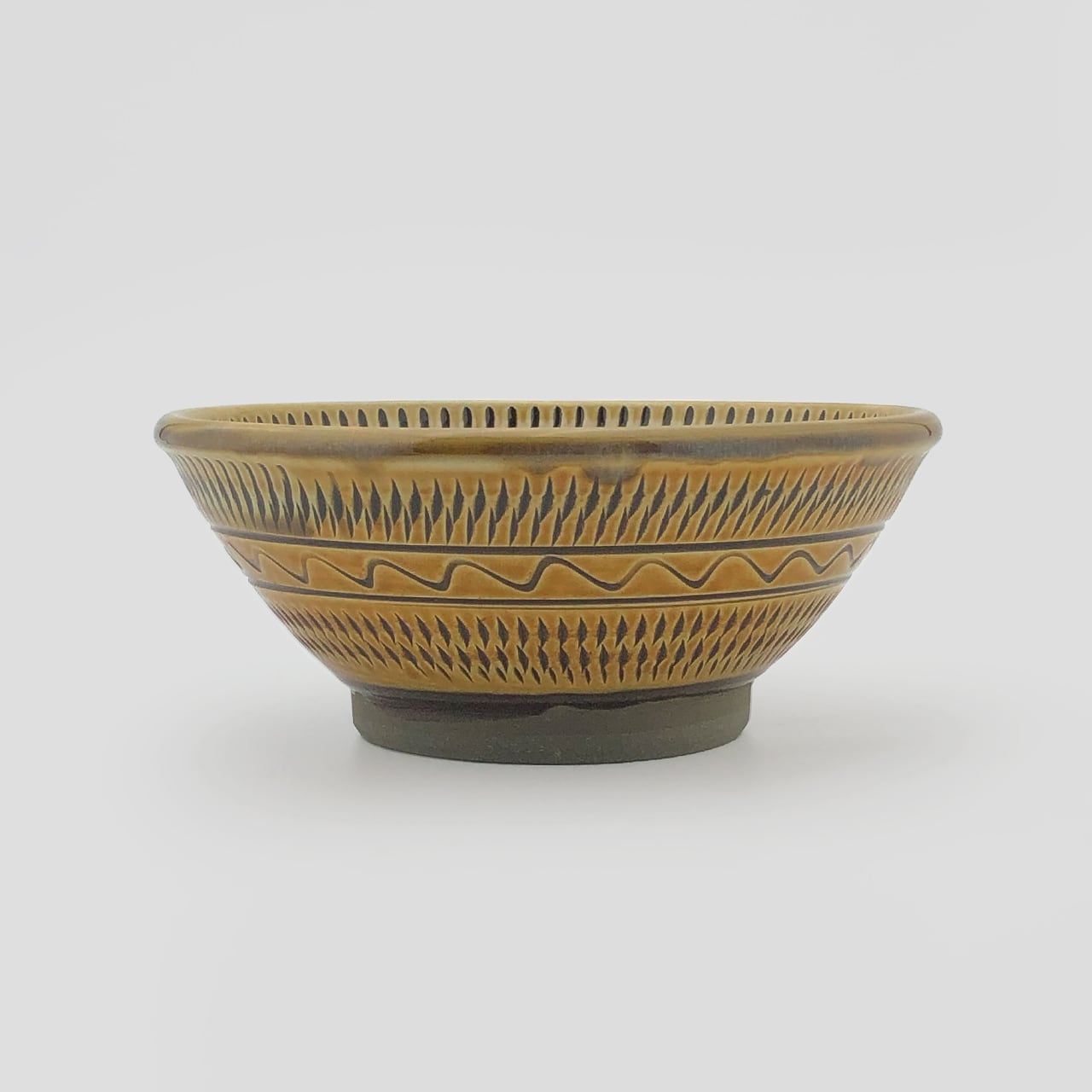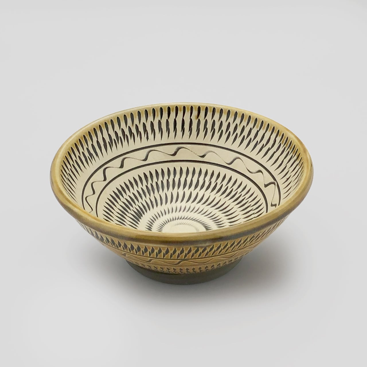器の内外に小鹿田焼の伝統技法である「飛び鉋(かんな)」を施しています。弾力性のある金属で作った鉋を使用し、細かい連続的な削り目をつけ模様をつける技法です。さらに、中段付近に木材で波線を描く「櫛描き」を加えて形をアクセントを加えています。納豆をかき混ぜる際に飛び鉋や櫛描きの溝で空気を含みやすくなり、ふんわりとした食感になります。