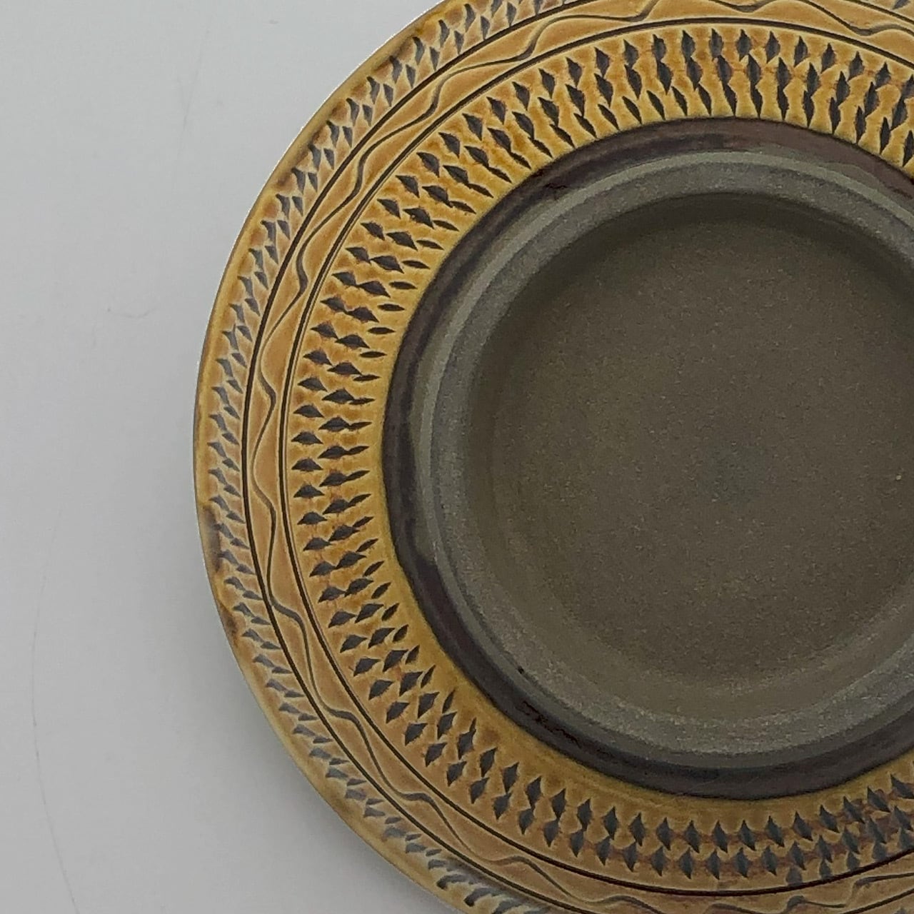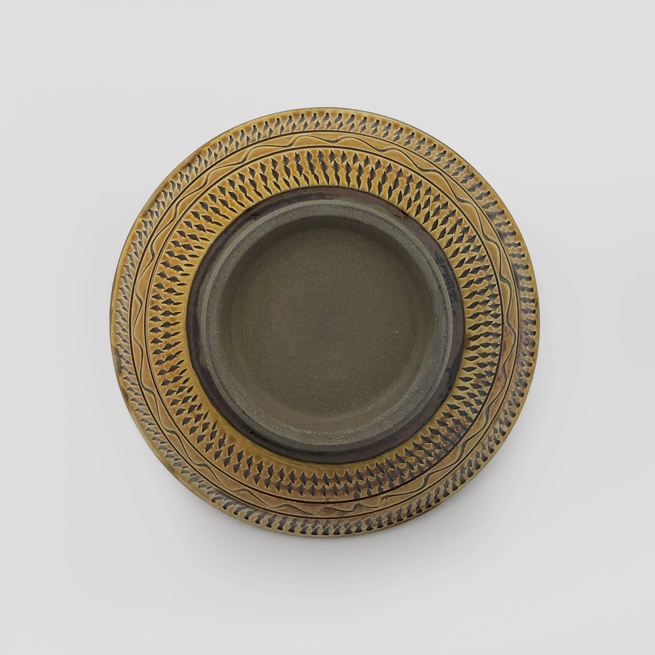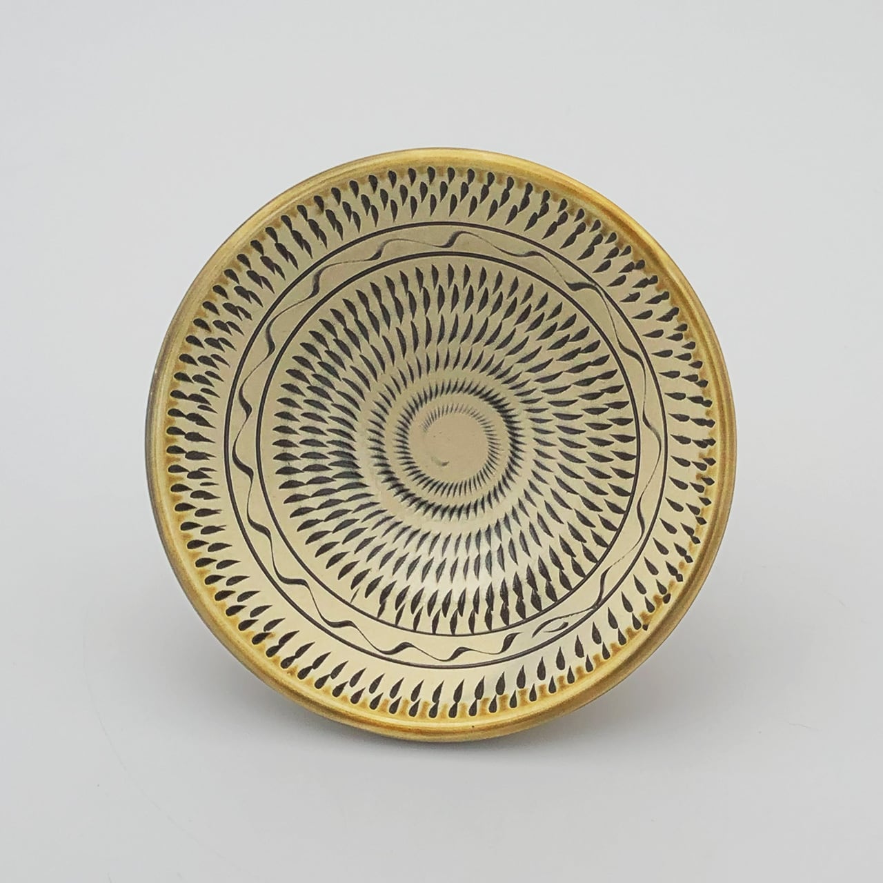 小鹿田焼はお皿等を複数枚重ねて焼きます。その際、重なった部分がくっついてしまわないよう、釉薬を剥がした跡が白い円(目剥ぎ)となって現れます。一番上で焼かれたものは目剥ぎがありません。目剥ぎは、兄弟窯の小石原焼にはなく、小鹿田焼の特徴のひとつでもあります。ご注文の際は目剥ぎの有無をご指定いただけません。ご了承ください。