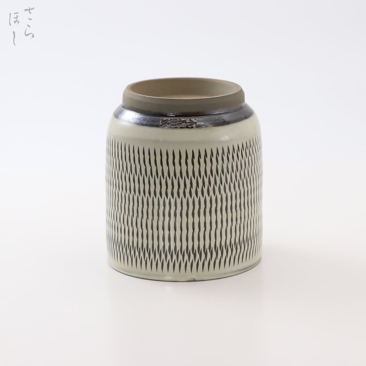 器の外側に小鹿田焼の伝統技法である「飛び鉋(かんな)」を施しています。成形後、足で蹴って回す蹴轆轤に乗せ、弾力性のある金属で作った鉋をバウンドさせながら押し当てて細かい連続的な削り目をつけ模様をつける技法です。