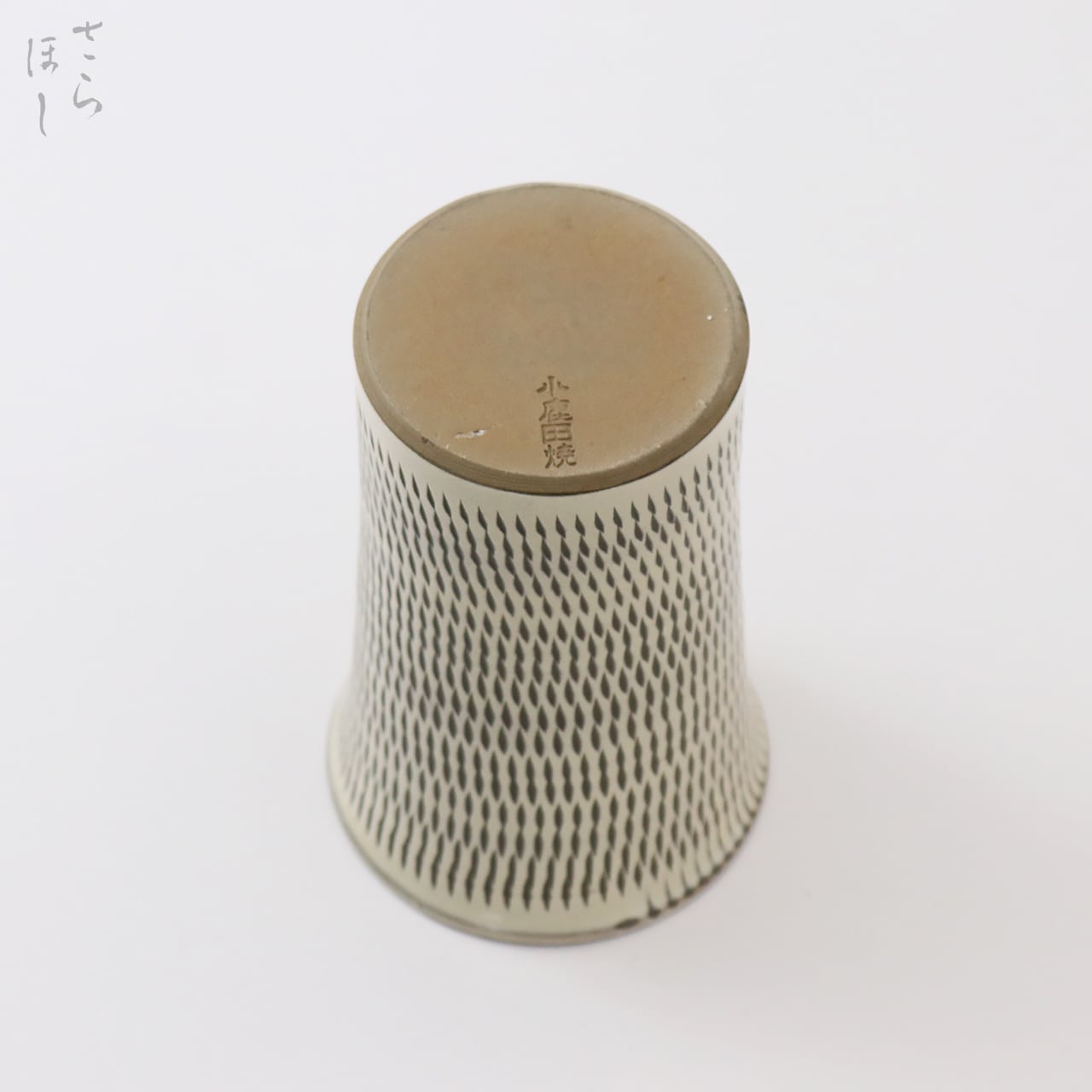 器の外側に小鹿田焼の伝統技法である「飛び鉋(かんな)」を施しています。弾力性のある金属で作った鉋を使用し、細かい連続的な削り目をつけ模様をつける技法です。