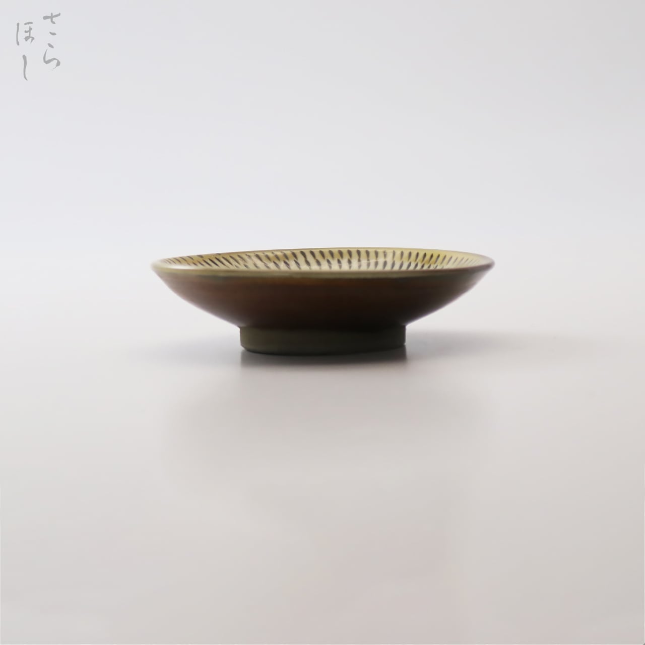 器の内側に小鹿田焼の伝統技法である「飛び鉋(かんな)」を施しています。弾力性のある金属で作った鉋を使用し、細かい連続的な削り目をつけ模様をつける技法です。