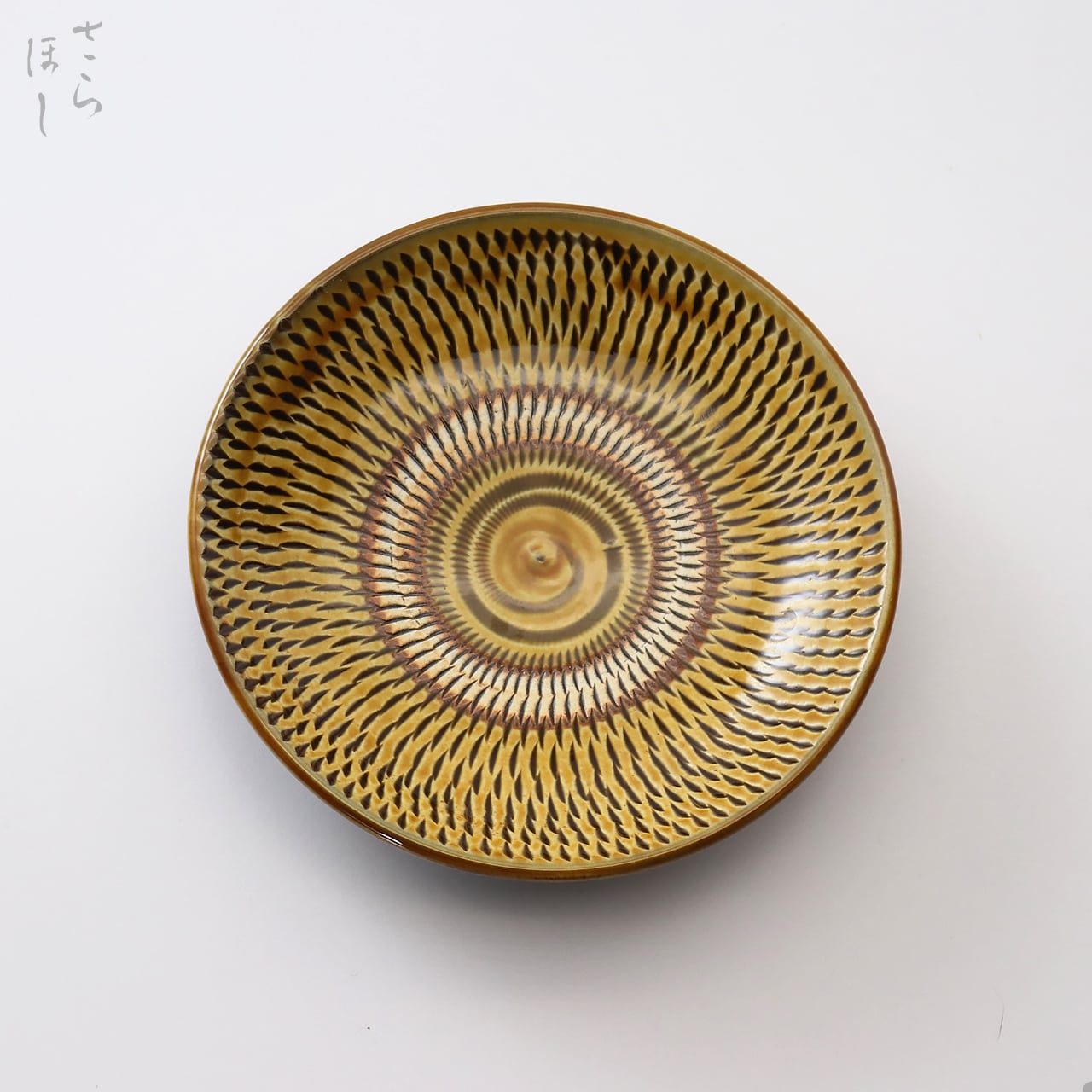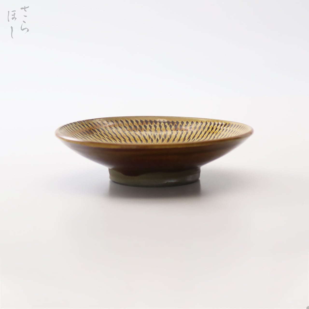 器の内側に小鹿田焼の伝統技法である「飛び鉋(かんな)」を施しています。弾力性のある金属で作った鉋を使用し、細かい連続的な削り目をつけ模様をつける技法です。