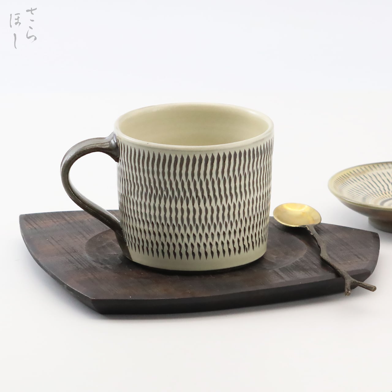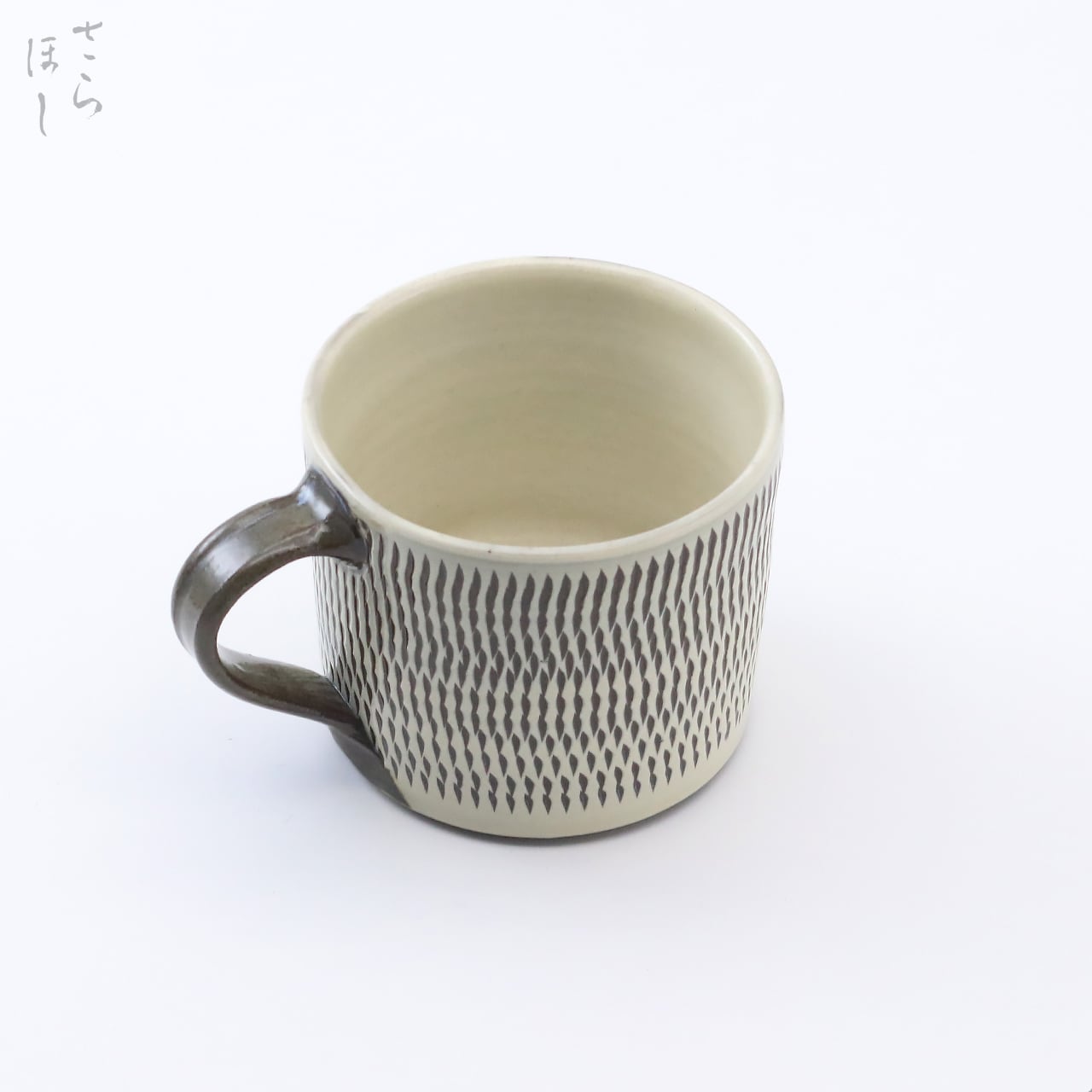 器の外側に小鹿田焼の伝統技法である「飛び鉋(かんな)」を施しています。弾力性のある金属で作った鉋を使用し、細かい連続的な削り目をつけ模様をつける技法です。