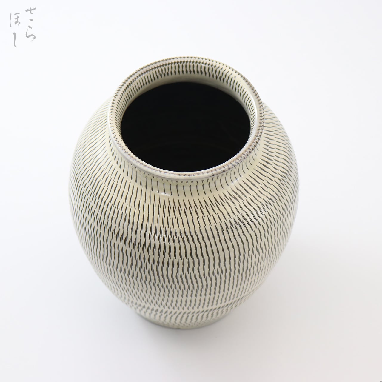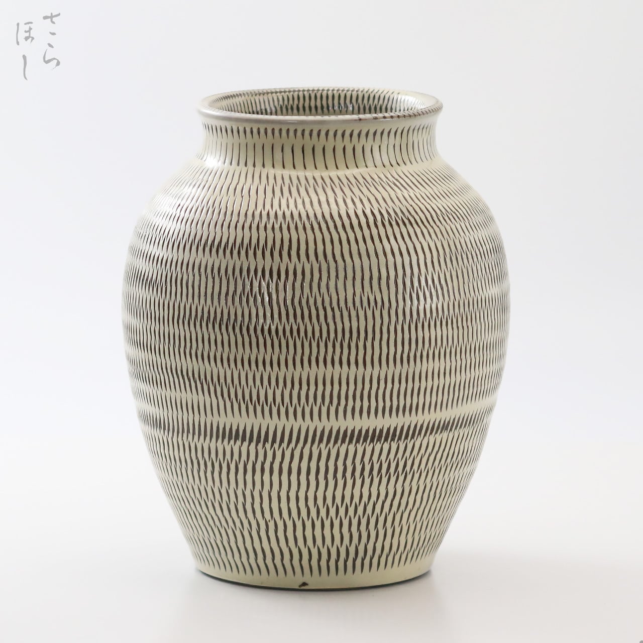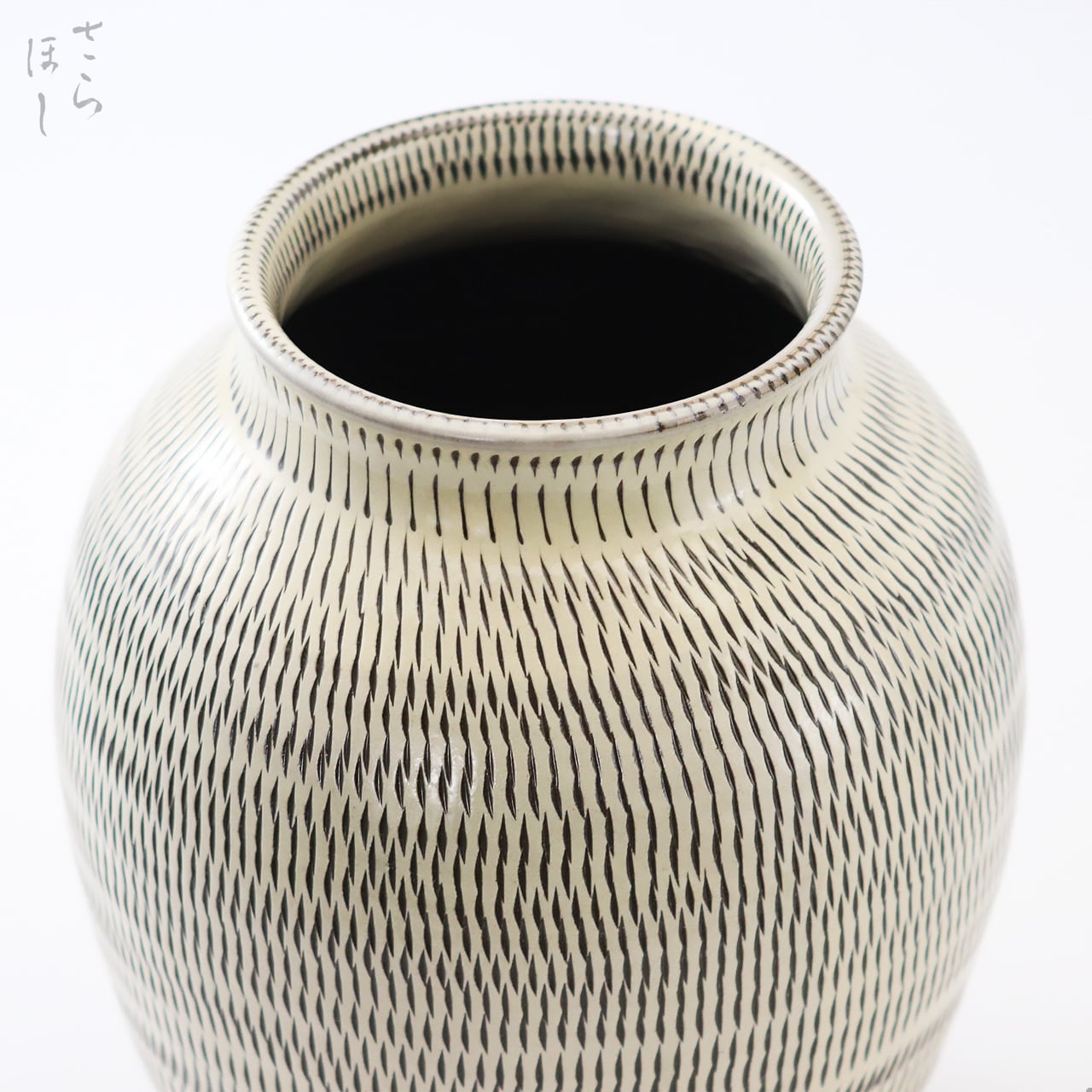 高さが約20cmの丸花瓶で、器の外側全面に素地の段階で小鹿田焼の伝統技法である「飛び鉋(かんな)」を施しています。飛び鉋は、弾力性のある金属で作った鉋を使用し、細かい連続的な削り目をつけ模様をつける技法です。不規則な間合いや余白のある模様は、職人の手作業ならではで見ていても飽きがきません。また、薪で焚く登り窯ならではの炎の揺らぎが表面に影を落とし、奥深い表情を描いてくれています。