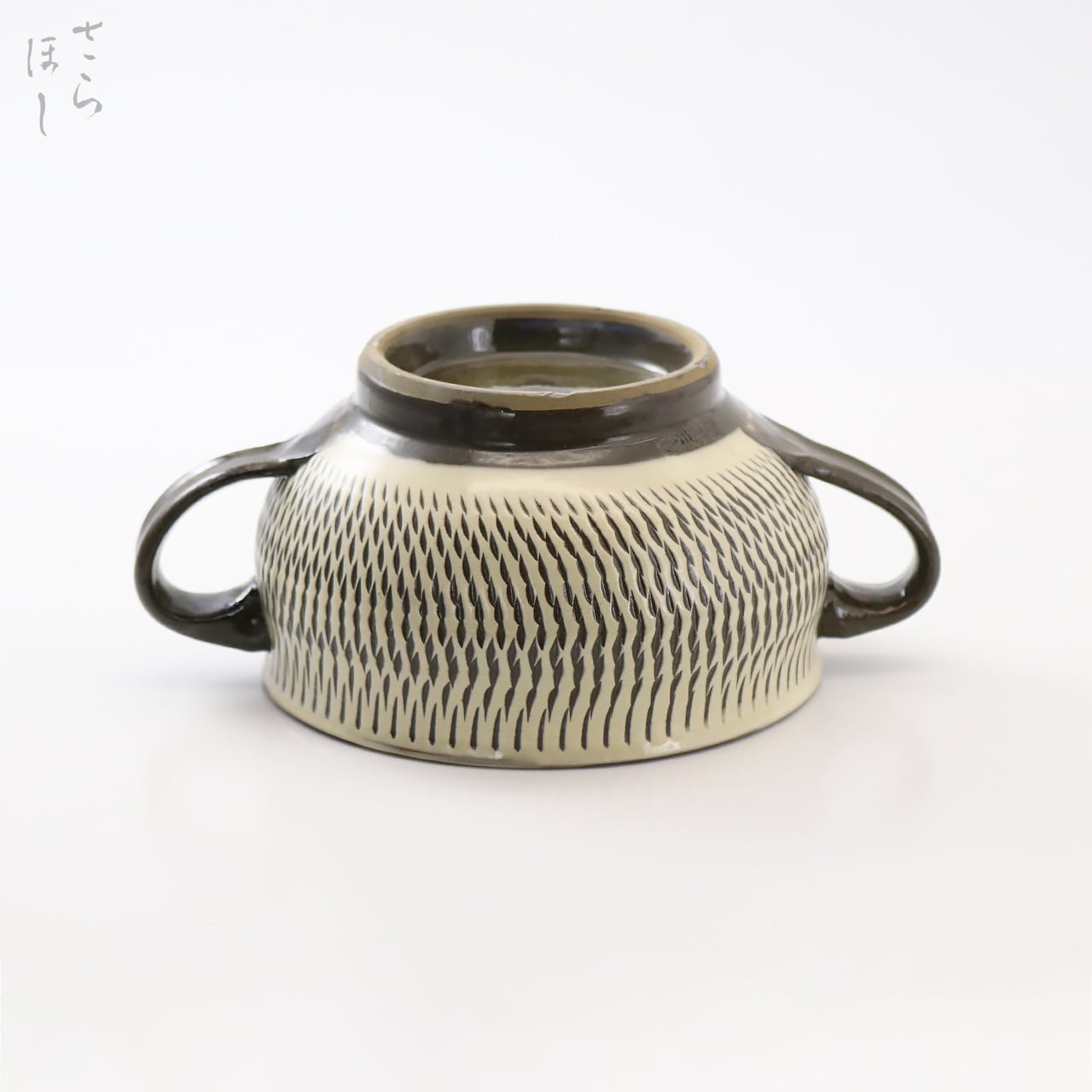 器の内側に小鹿田焼の伝統技法である「飛び鉋(かんな)」を施しています。弾力性のある金属で作った鉋を使用し、細かい連続的な削り目をつけ模様をつける技法です。外側は釉薬を掛分け、ツートンカラーになっています。