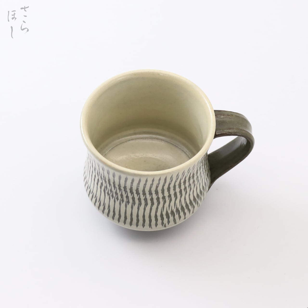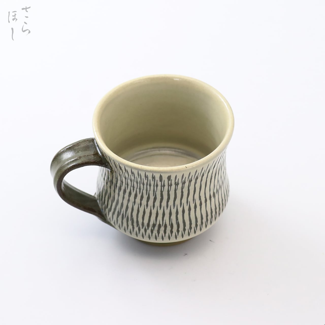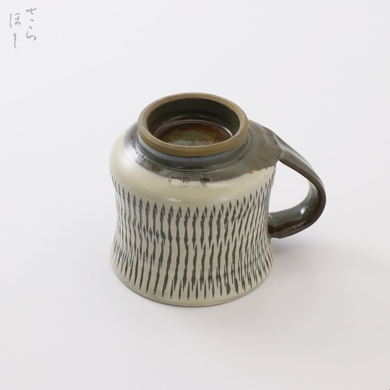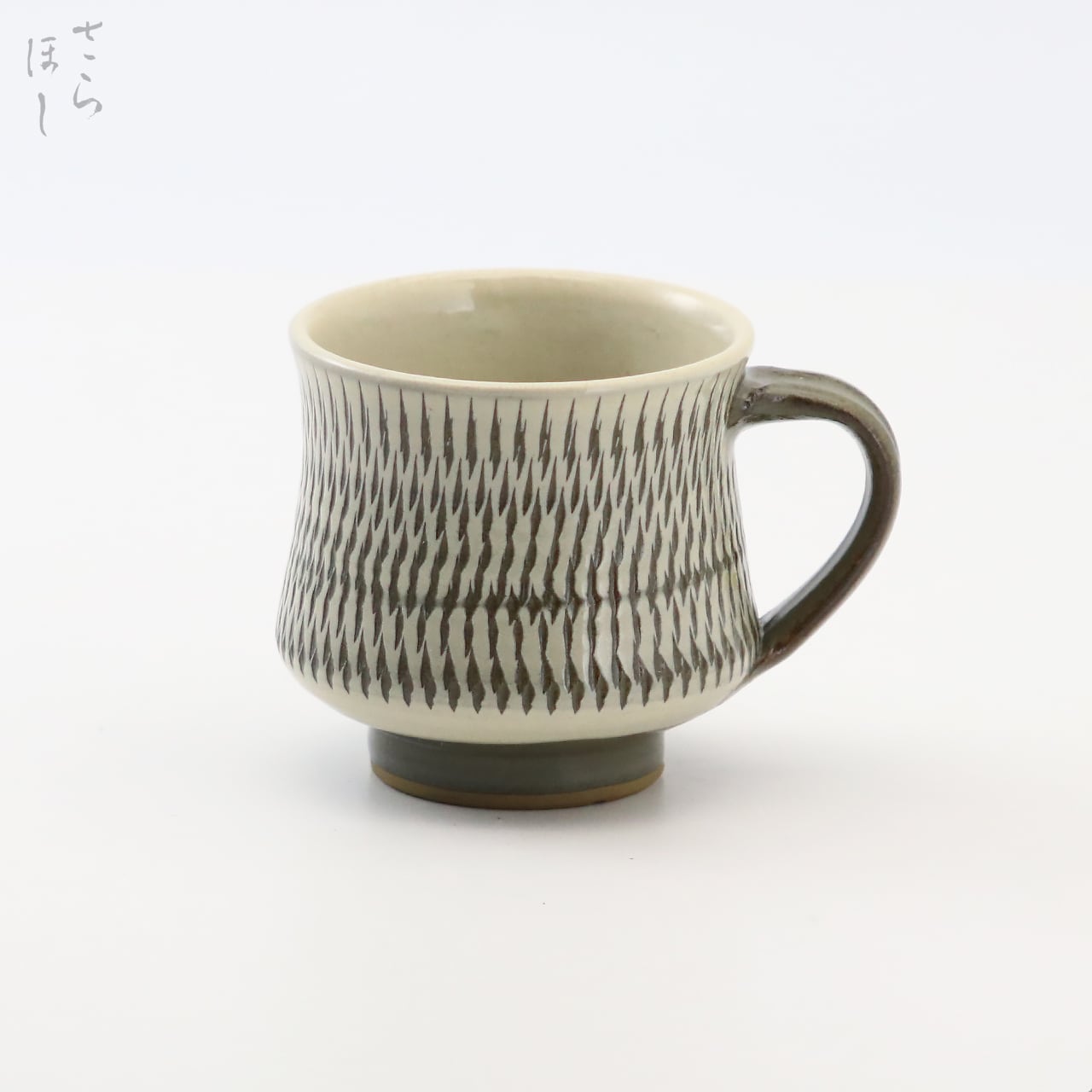 器の外側に小鹿田焼の伝統技法である「飛び鉋(かんな)」を施しています。弾力性のある金属で作った鉋を使用し、細かい連続的な削り目をつけ模様をつける技法です。