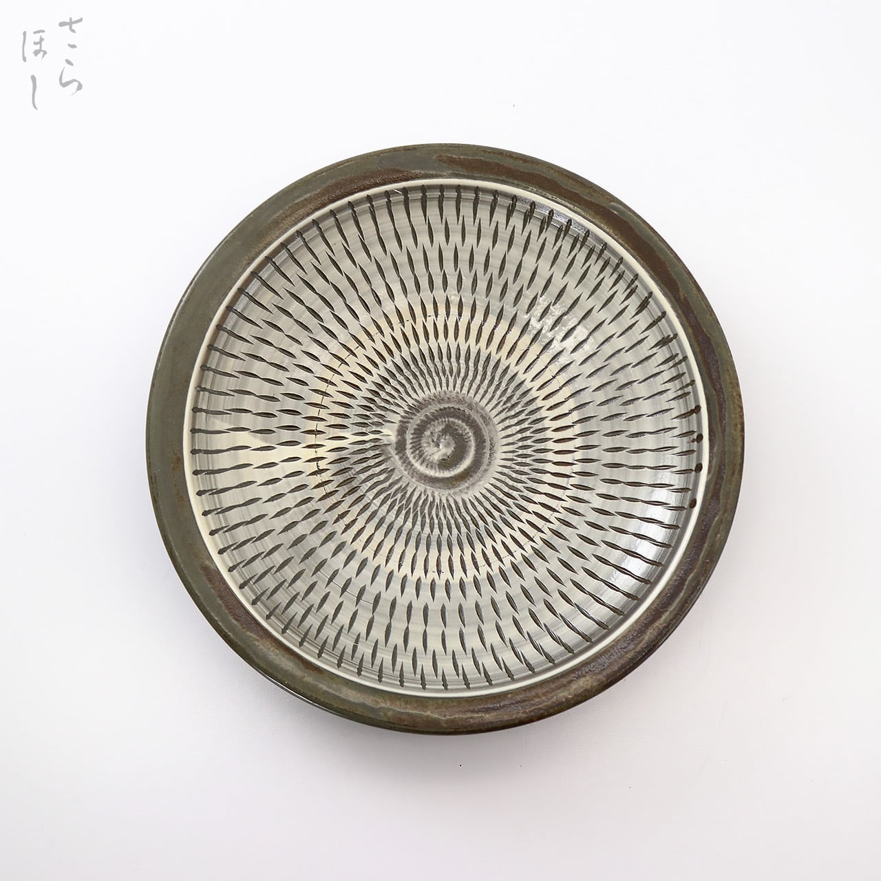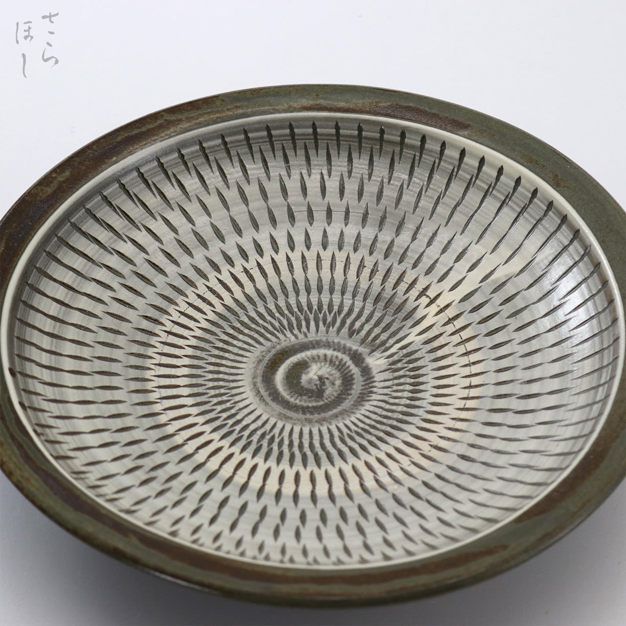 器の内側に小鹿田焼の伝統技法である「飛び鉋(かんな)」を施しています。弾力性のある金属で作った鉋を使用し、細かい連続的な削り目をつけ模様をつける技法です。