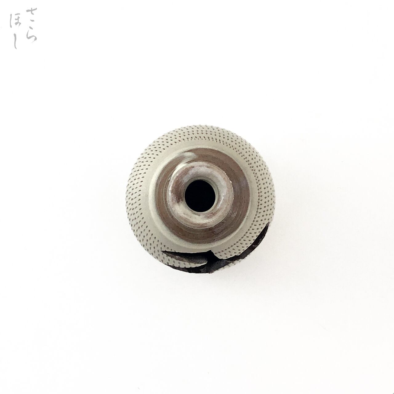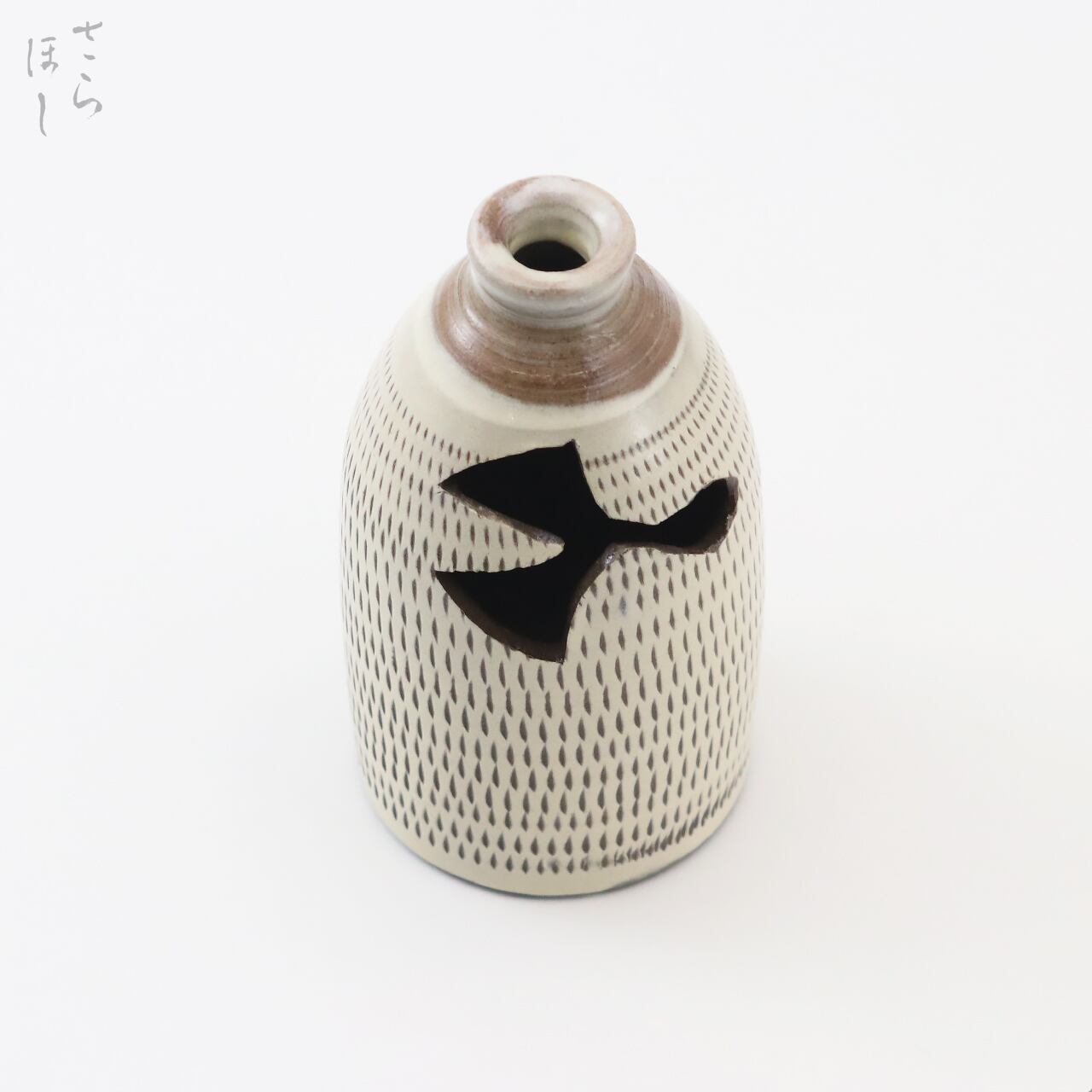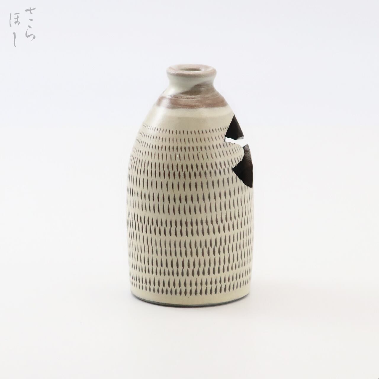 高さが約10.5cmあります。「花入」(つりはないれ)は、花を入れて茶席に飾る茶道具で天井から紐や鎖でつるす花入れになります。装飾として器に白化粧土を掛け、小鹿田焼の伝統技法である「飛び鉋(かんな)」を施しています。飛び鉋は、弾力性のある金属で作った鉋を使用し、細かい連続的な削り目をつけ模様をつける技法です。徳利に花を差し込む穴の部分が即興で開けられており、穴の形がひとつひとつ異なります。つるすための紐等は付属しておりません。普段使いではつるさず花瓶として使用できます。