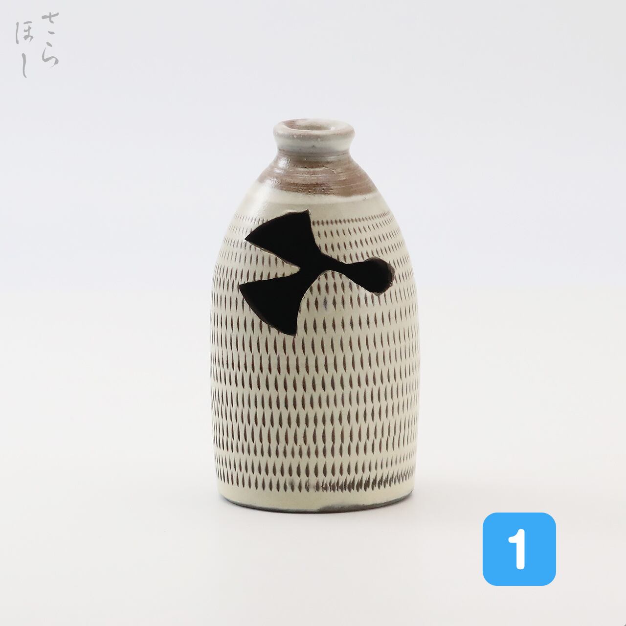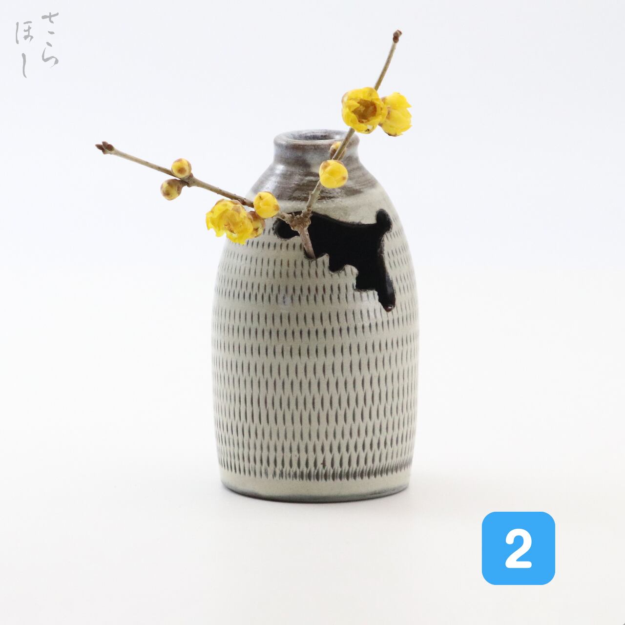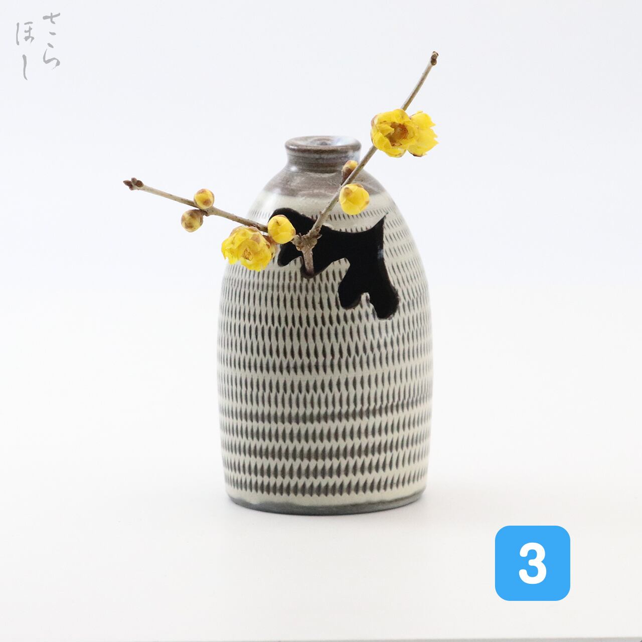 高さが約10.5cmあります。「花入」(つりはないれ)は、花を入れて茶席に飾る茶道具で天井から紐や鎖でつるす花入れになります。装飾として器に白化粧土を掛け、小鹿田焼の伝統技法である「飛び鉋(かんな)」を施しています。飛び鉋は、弾力性のある金属で作った鉋を使用し、細かい連続的な削り目をつけ模様をつける技法です。徳利に花を差し込む穴の部分が即興で開けられており、穴の形がひとつひとつ異なります。つるすための紐等は付属しておりません。普段使いではつるさず花瓶として使用できます。