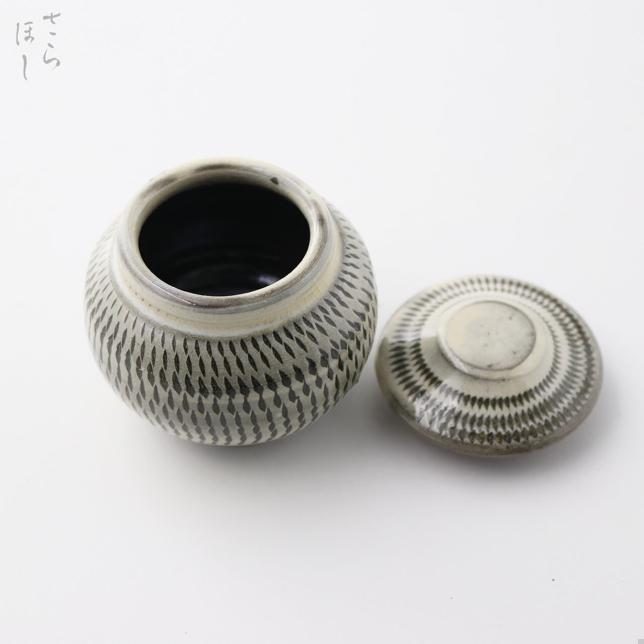 器の外側に小鹿田焼の伝統技法である「飛び鉋(かんな)」を施しています。弾力性のある金属で作った鉋を使用し、細かい連続的な削り目をつけ模様をつける技法です。