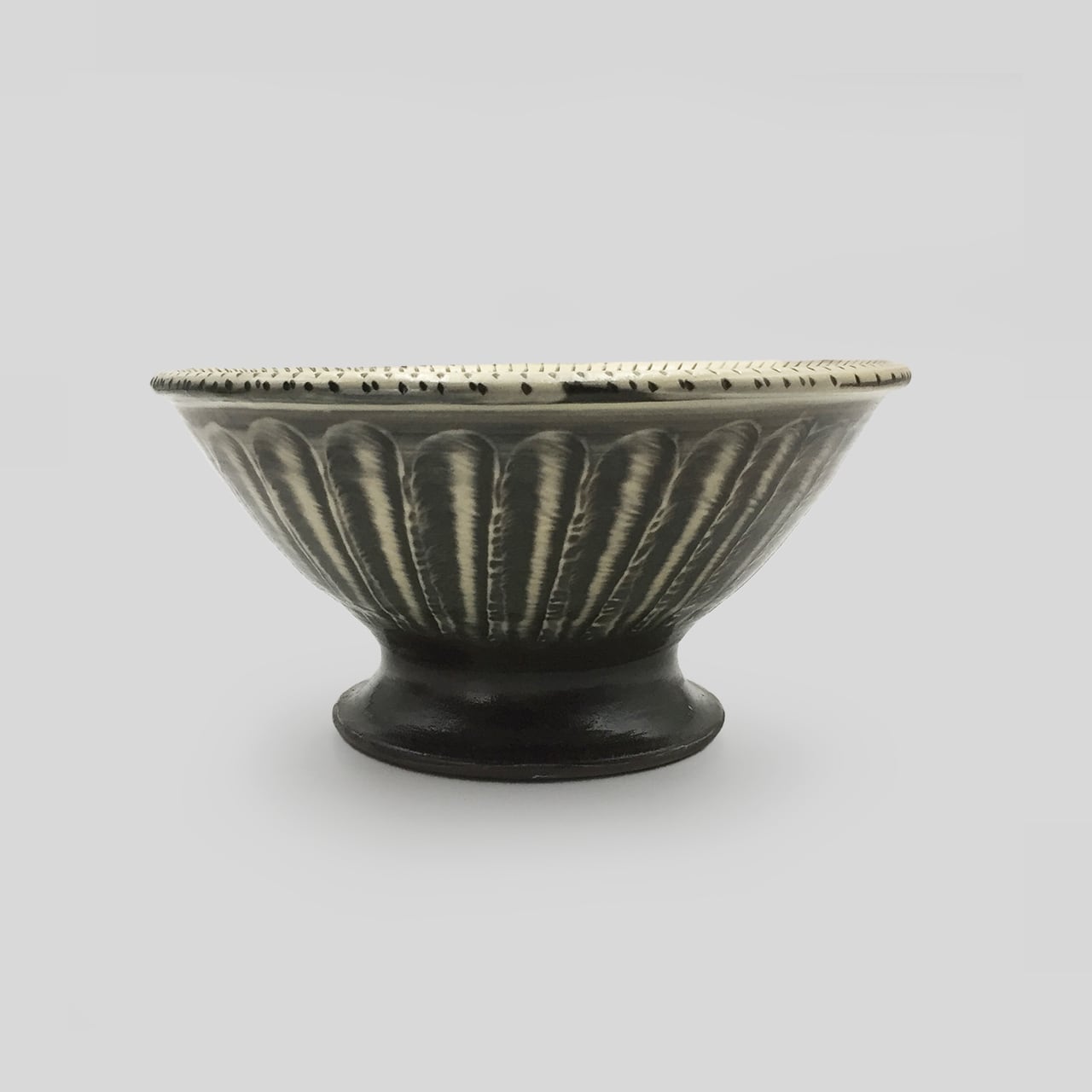 器の内側に小鹿田焼の伝統技法である「飛び鉋(かんな)」を施しています。弾力性のある金属で作った鉋を使用し、細かい連続的な削り目をつけ模様をつける技法です。さらに、外側には、「打ち刷毛目(はけめ)」を施しています。刷毛を使って化粧土で連続的な模様をつける技法です。